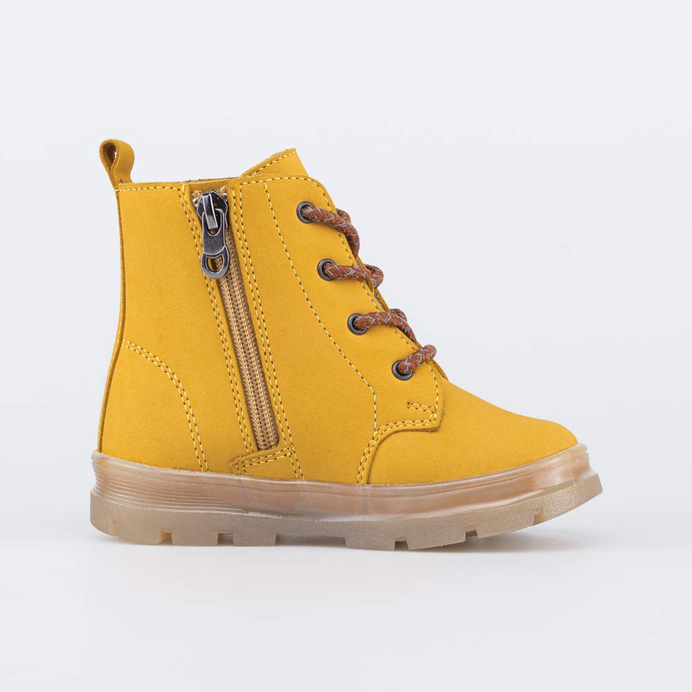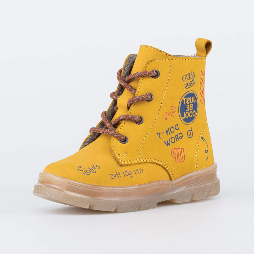 Верх этих детских ботинок изготовлен из гипоаллергенной и дышащей натуральной кожи-нубука стильного горчичного цвета и украшен принтом.