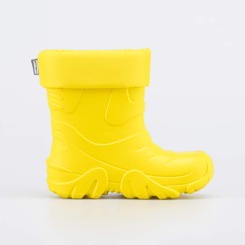 Детские утепленные сапоги из легкого, гибкого и амортизирующего материала ЭВА выполнены в позитивном желтом цвете. Имеют вкладной чулок и учитывают особенности детской стопы.