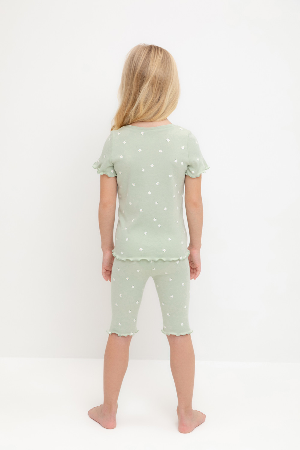 Трикотажная пижама в рубчик из натурального хлопка. Футболка с короткими втачными рукавами и шорты с эластичной резинкой в поясе. Оригинальная набивка выполнена из стойких текстильных гипоаллергенных красителей. Изделие сохраняет цвет и форму после многократных стирок. Все трикотажные полотна производятся в соответсвии с нормами швейцарского сертификата ЭкоТекс.