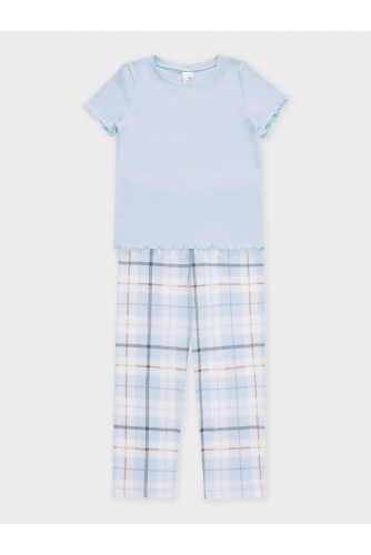 Трикотажная пижама из натурального хлопка. Футболка с короткими втачными рукавами изготовлена из эластичного трикотажа в рубчик. Брюки с эластичной резинкой в поясе выполнены из гладкого трикотажа супрем. Оригинальная набивка выполнена из стойких текстильных гипоаллергенных красителей. Изделие сохраняет цвет и форму после многократных стирок. Все трикотажные полотна производятся в соответсвии с нормами швейцарского сертификата ЭкоТекс.