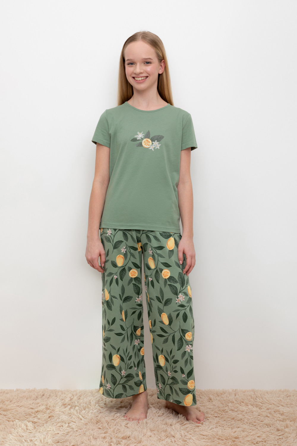 Трикотажный пижамный комплект из натурального хлопка. В комплекте футболка с короткими рукавами и со спущенными плечами. Укороченные брюки с удобным поясом на резинке. Оригинальная набивка и принт выполнены из стойких, гипоаллергенных текстильных красителей. Все трикотажные полотна производятся в соответствии с нормами Швейцарского сертификата ЭкоТекс.