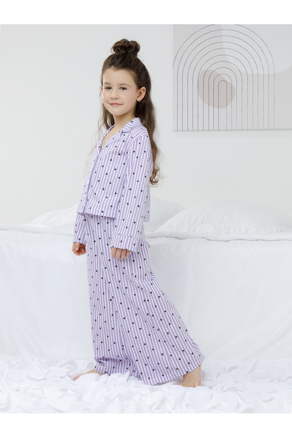 Трикотажная пижама из натурального хлопка для комфортного сна и отдыха. Рубашка на пуговицах с длинными рукавами и широкие брюки с мягкой эластичной резинкой в поясе. Набивной рисунок выполнен из стойких текстильных гипоаллергенных красителей. Изделие сохраняет цвет и форму после многократных стирок. Все трикотажные полотна производятся в соответствии с нормами швейцарского сертификата ЭкоТекс.