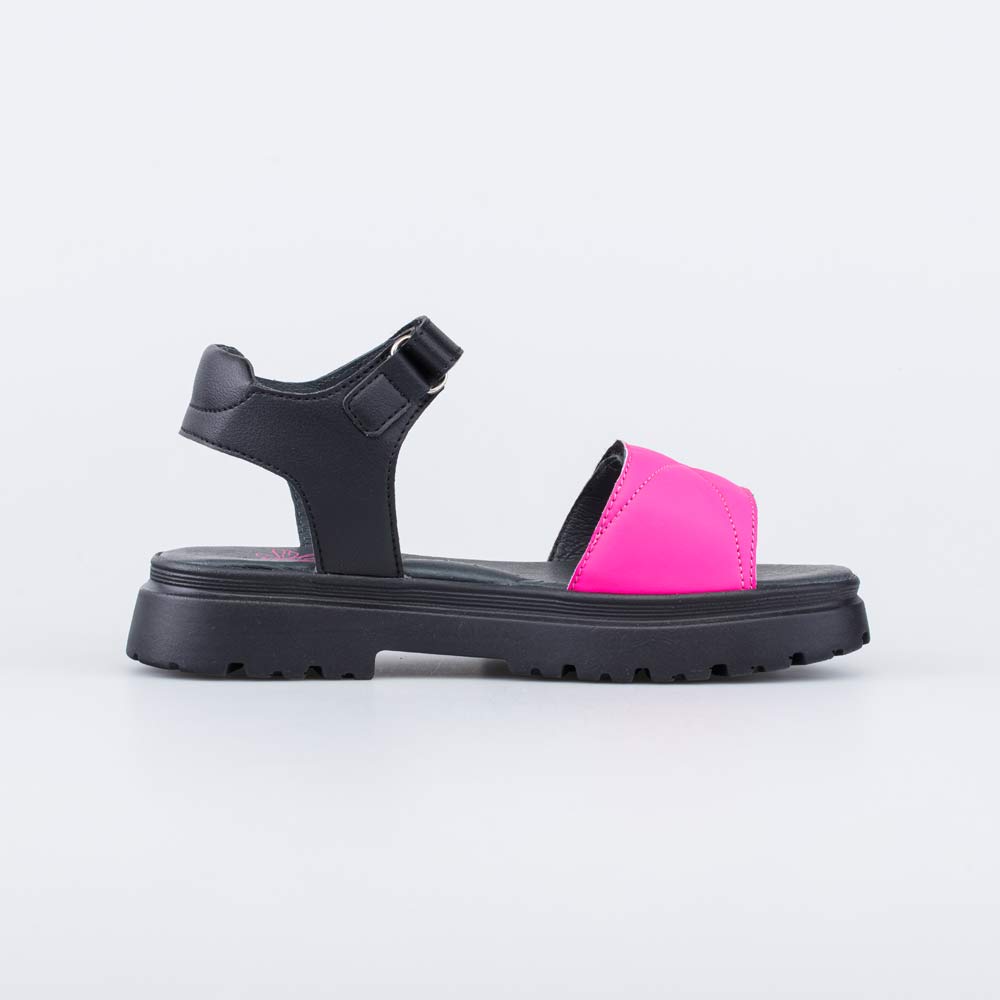 Сандалии выполнены в черном цвете и ярким акцентом фуксии.