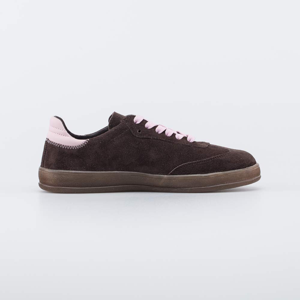 Верх этих демисезонных полуботинок для девочек изготовлен из дышащей натуральной кожи-велюра глубокого коричневого цвета, который дополнен нежно-розовыми акцентами.