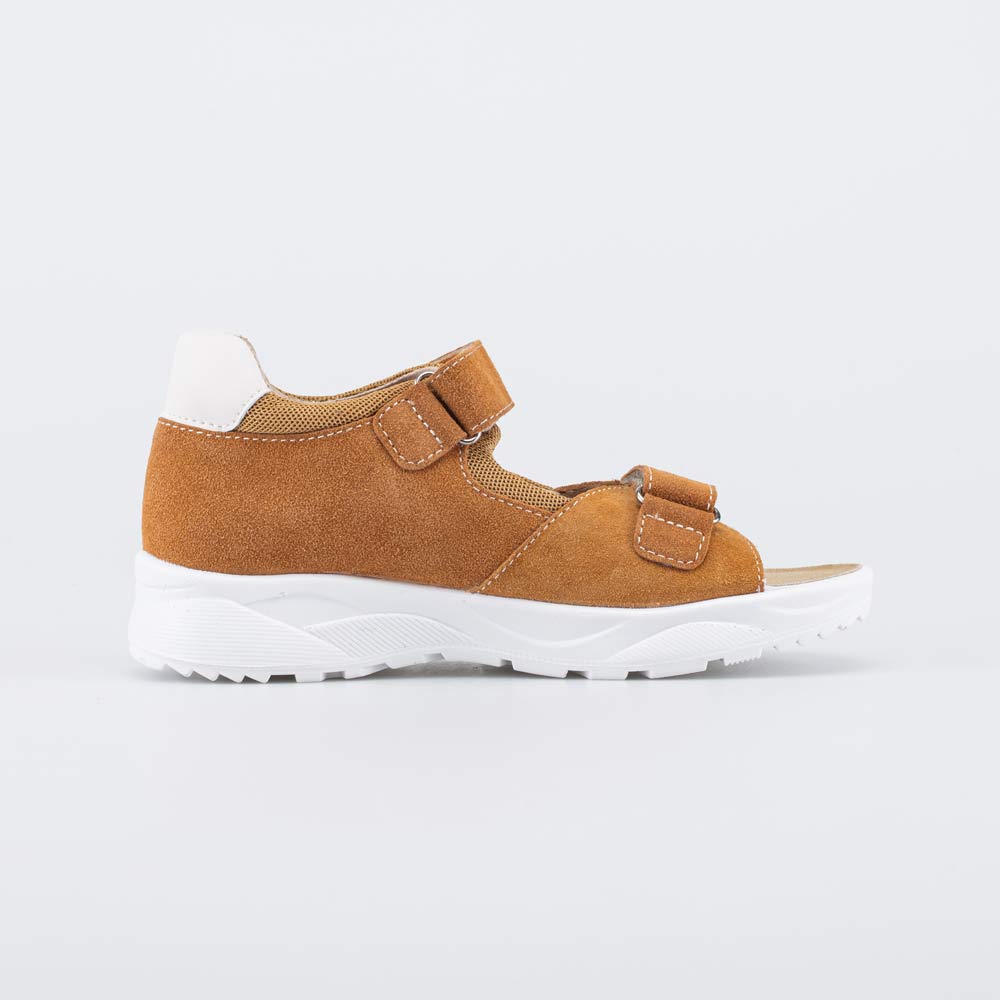 Детские сандалии имеют верх из натуральной кожи-велюра. Подкладка и несъемная стелька из белой натуральной кожи обеспечивают гигиенические свойства и защищают носочки от окрашивания.