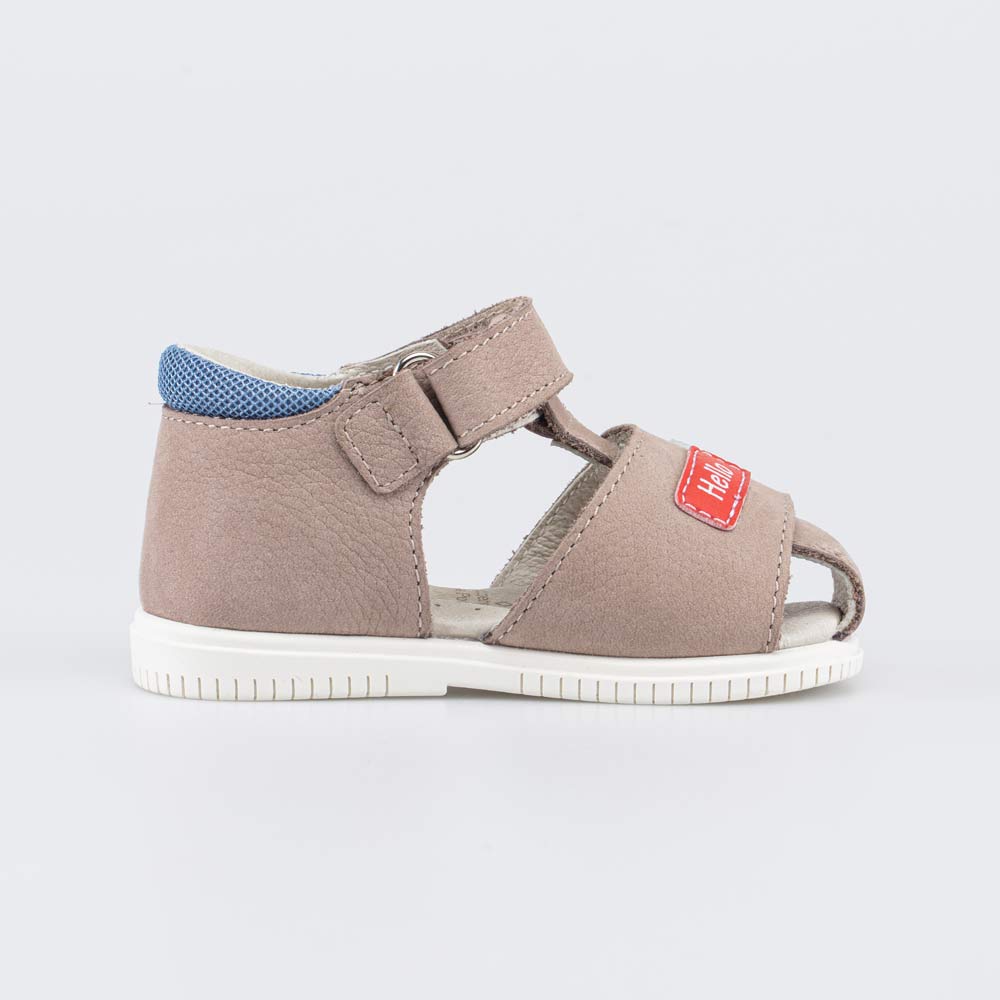 Верх изготовлен из натуральной кожи-нубука коричневого цвета и украшен позитивными нашивками. Подкладка и несъемная стелька также выполнены из натуральной кожи, что обеспечивает оптимальный микроклимат внутри детской обуви.