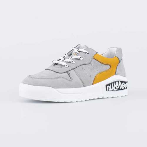 Ботинки декорированы черной вставкой с надписями на подошве, принтом на язычке и несквозной перфорацией.