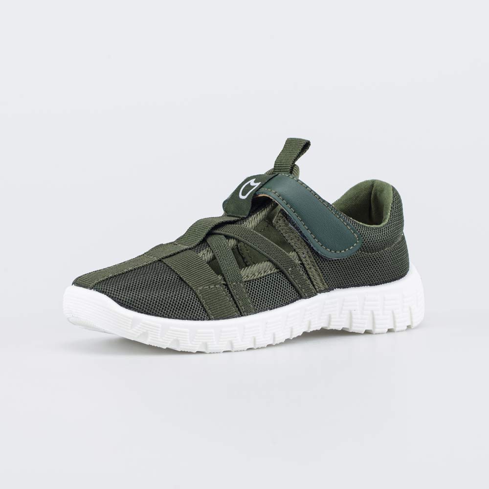Оливковые текстильные кроссовки для мальчика подходят для жарких дней и повседневного использования в детском саду.