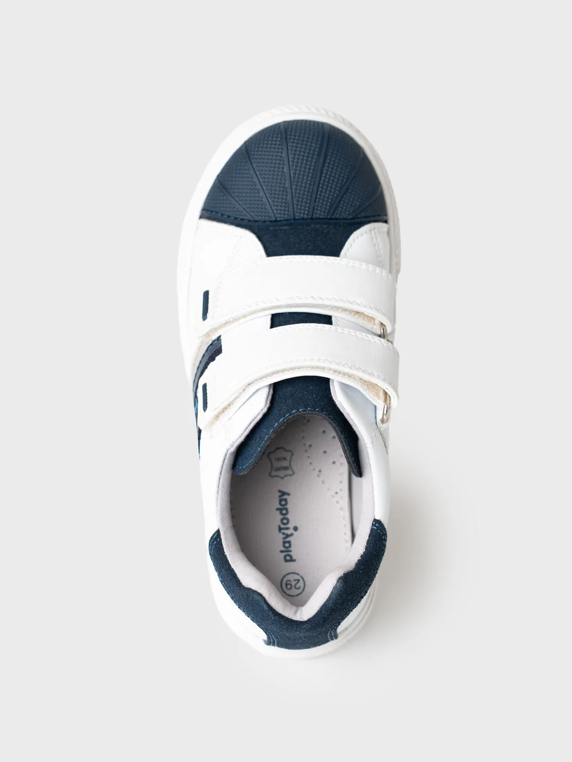 Трендовые кеды для мальчика с защитой носочной части. Две липучки создают удобство при обувании. В обуви используется текстильная подкладка c высоким содержанием хлопка 80%, которая обладает высокой гигроскопичностью. Стелька выполнена из натуральной кожи и имеет анатомический элемент для поддержания свода стопы в правильном положении. Формоустойчивый задник поддерживает стопу в правильном положении. Эргономичная форма колодки обеспечивает правильное формирование стопы ребенка. Подошва из ТПР не скользит, очень легкая и гибкая.
