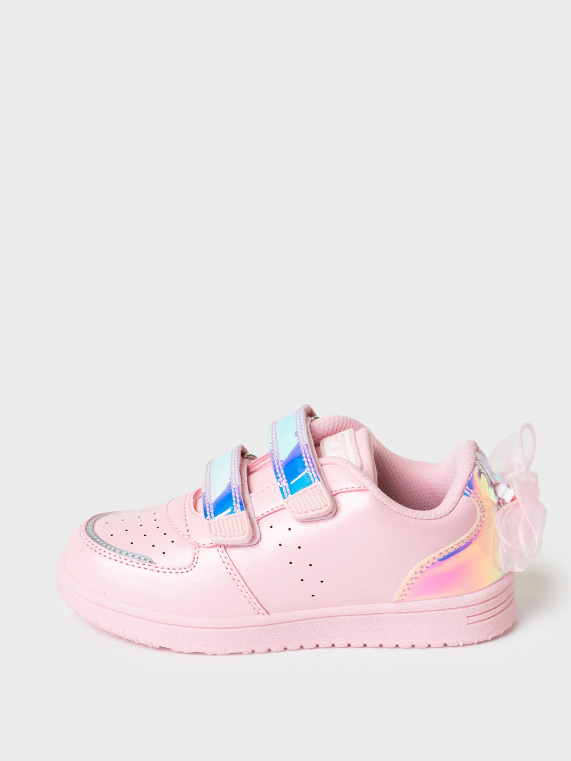 Оригинальные кеды для девочек с огромным бантом из органзы сзади. При желании бант можно снять. Две удобные застежки липучки позволяют ребенку обувать кроссовки самостоятельно. Кроссовки выполнены из искусственной кожи, по своим свойствам схожим с натуральной кожей. В обуви есть светоотражающие элементы. В носочной части обуви стоит текстильная подкладка c высоким содержанием хлопка 80%, которая обладает высокой гигроскопичностью. В пяточной части обуви текстильная подкладка обладает хорошей износостойкостью. Профилированная съемная стелька из натуральной кожи с анатомической формой подсводника обеспечивает правильную нагрузку на стопу. Формоустойчивый задник поддерживает стопу в правильном положении. Эргономичная форма колодки обеспечивает правильное формирование стопы ребенка. Подошва из ТПР гибкая, не скользит и устойчива к истиранию.