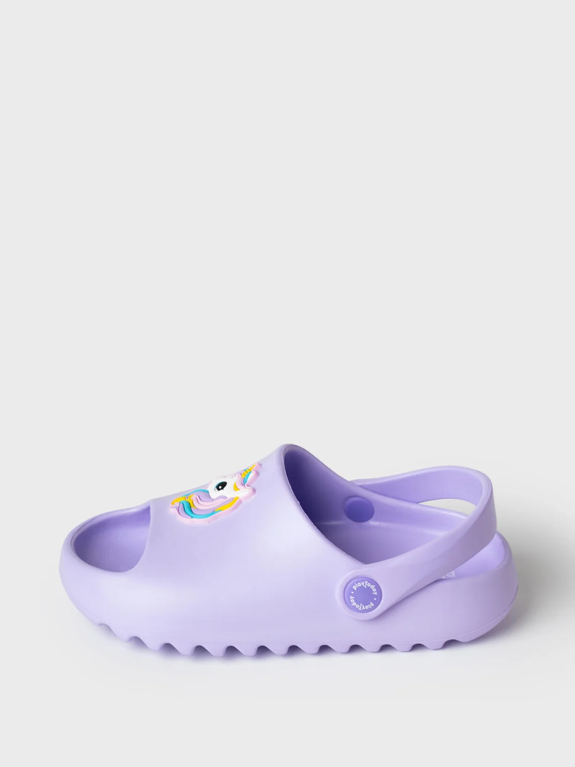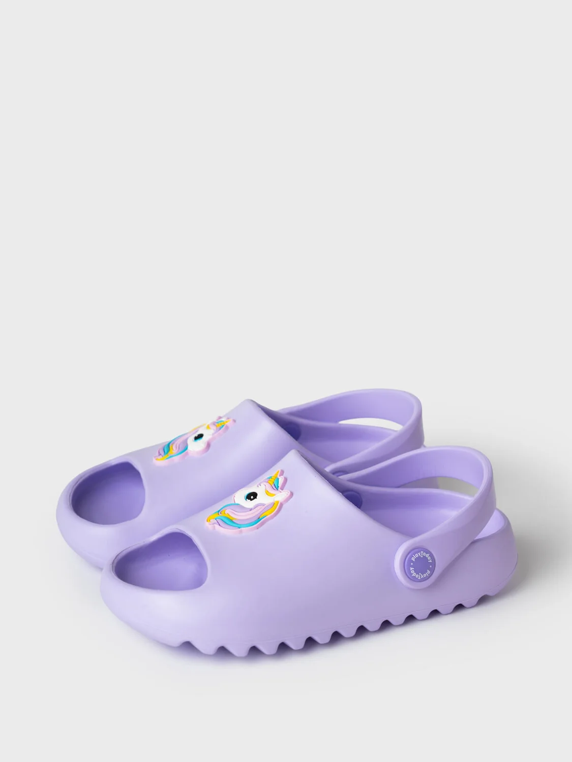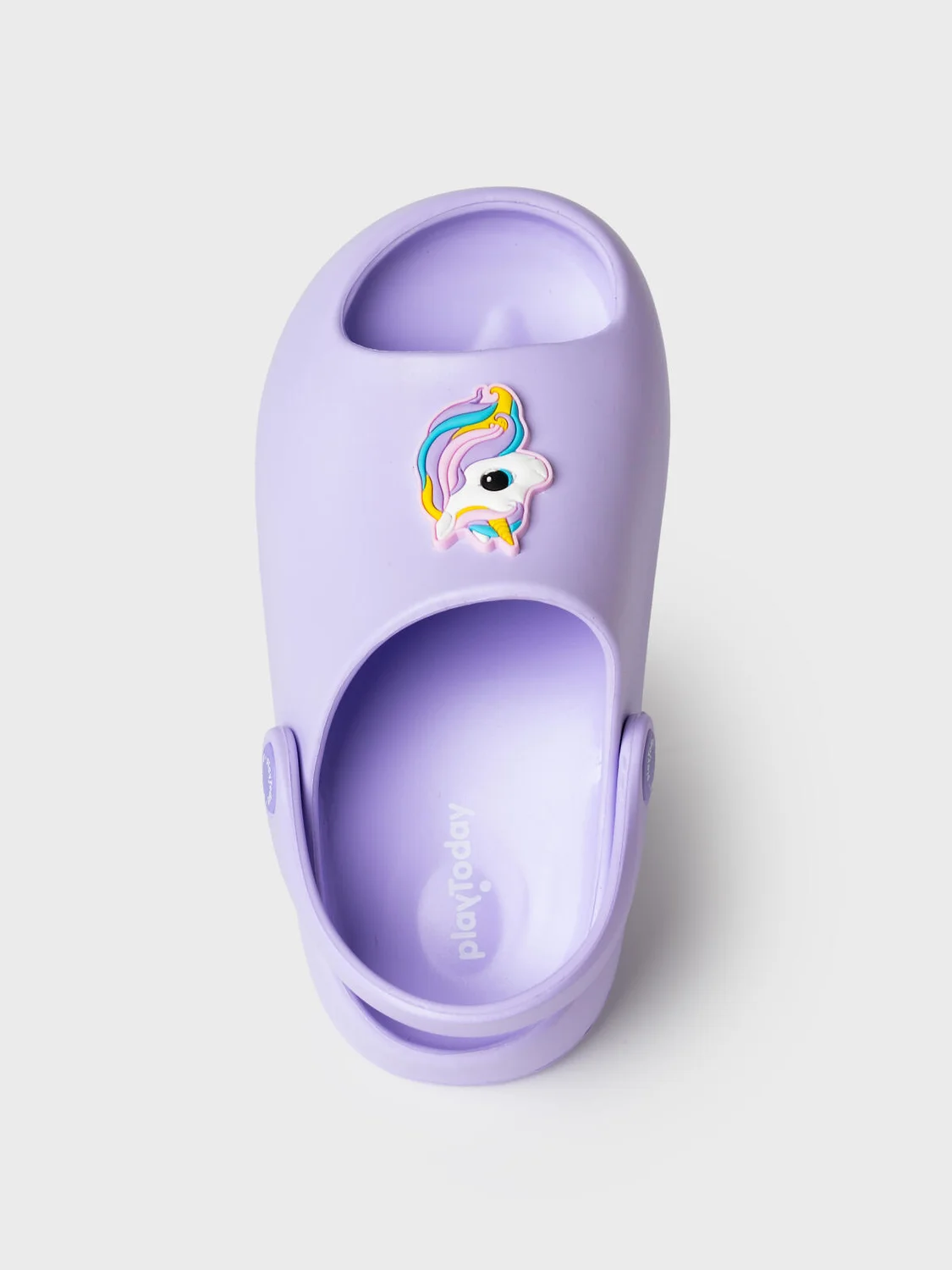 Сабо детские для девочки. Сабо из облегченного и прочного ЭВА с патчем единорогом. Материал хорошо моется. Форма модели учитывает эргономику стопы. Модель имеет перекидной ремешок для лучшей фиксации обуви на ноге.