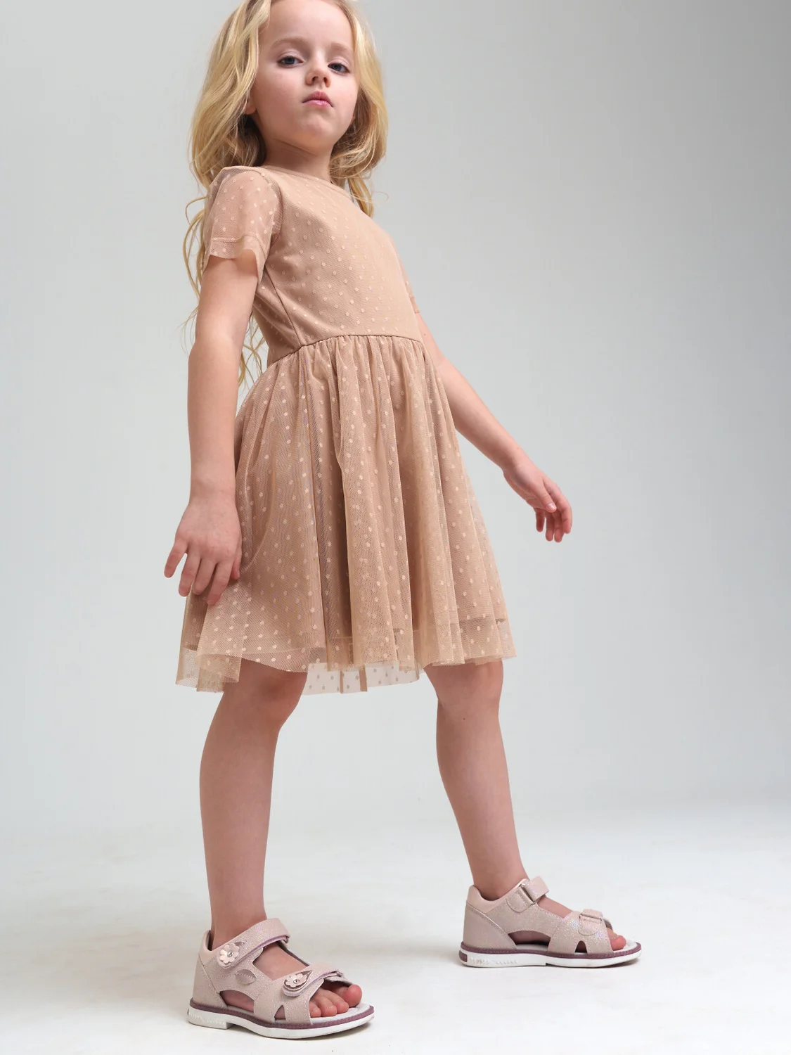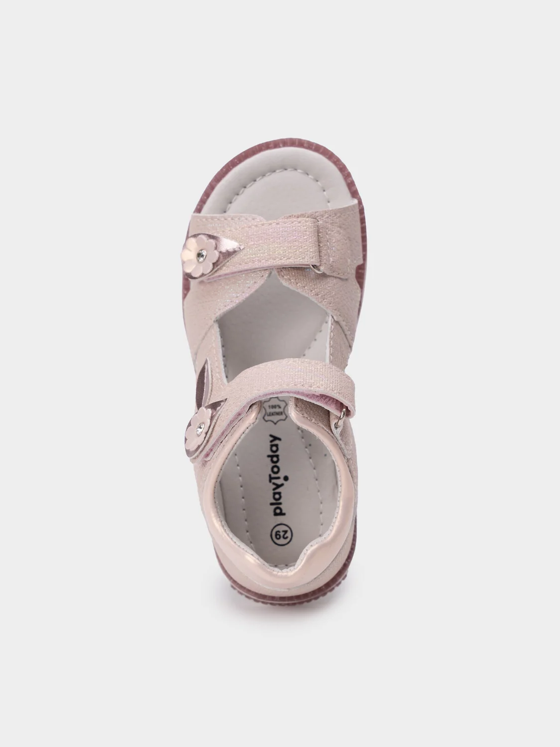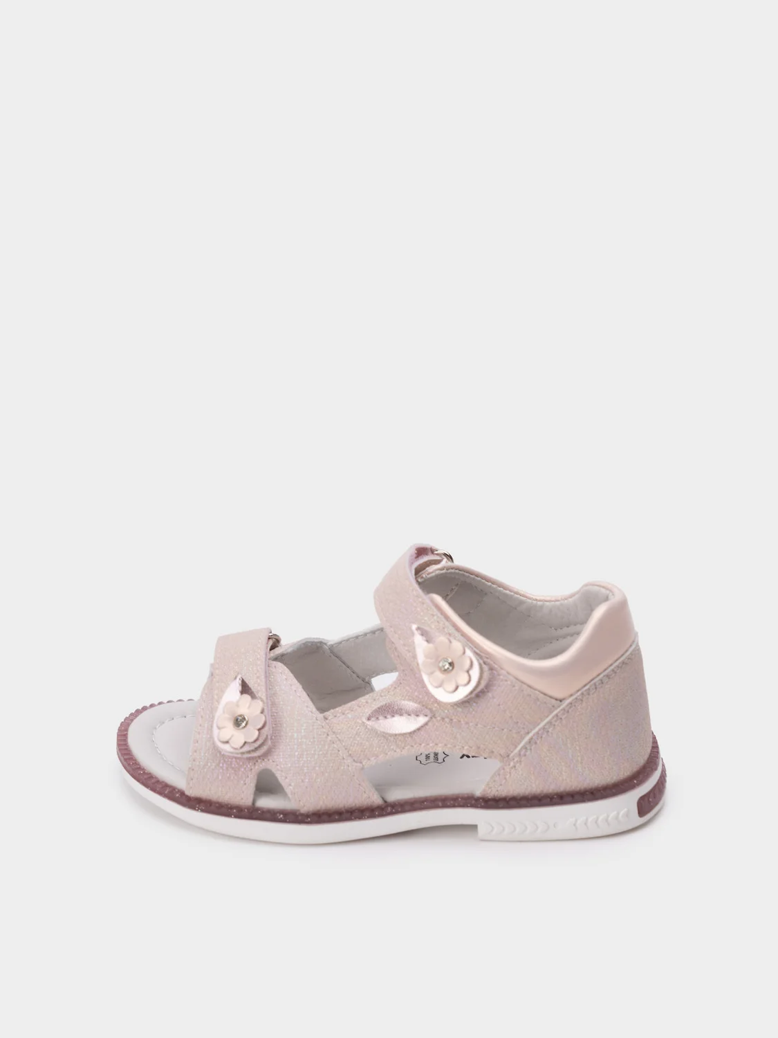 Сандалии детские для девочки. Сандалии с закрытой пяткой выполнены из перламутровой искусственной кожи. Удобные ремни с липучками позволяют регулировать обувь на любой подъем. Подкладка и стелька выполнены из натуральной свиной кожи. Стелька имеет анатомический элемент для поддержания свода стопы в правильном положении. Подошва из ТПР имеет оригинальные вставки в виде цветов из глитера.