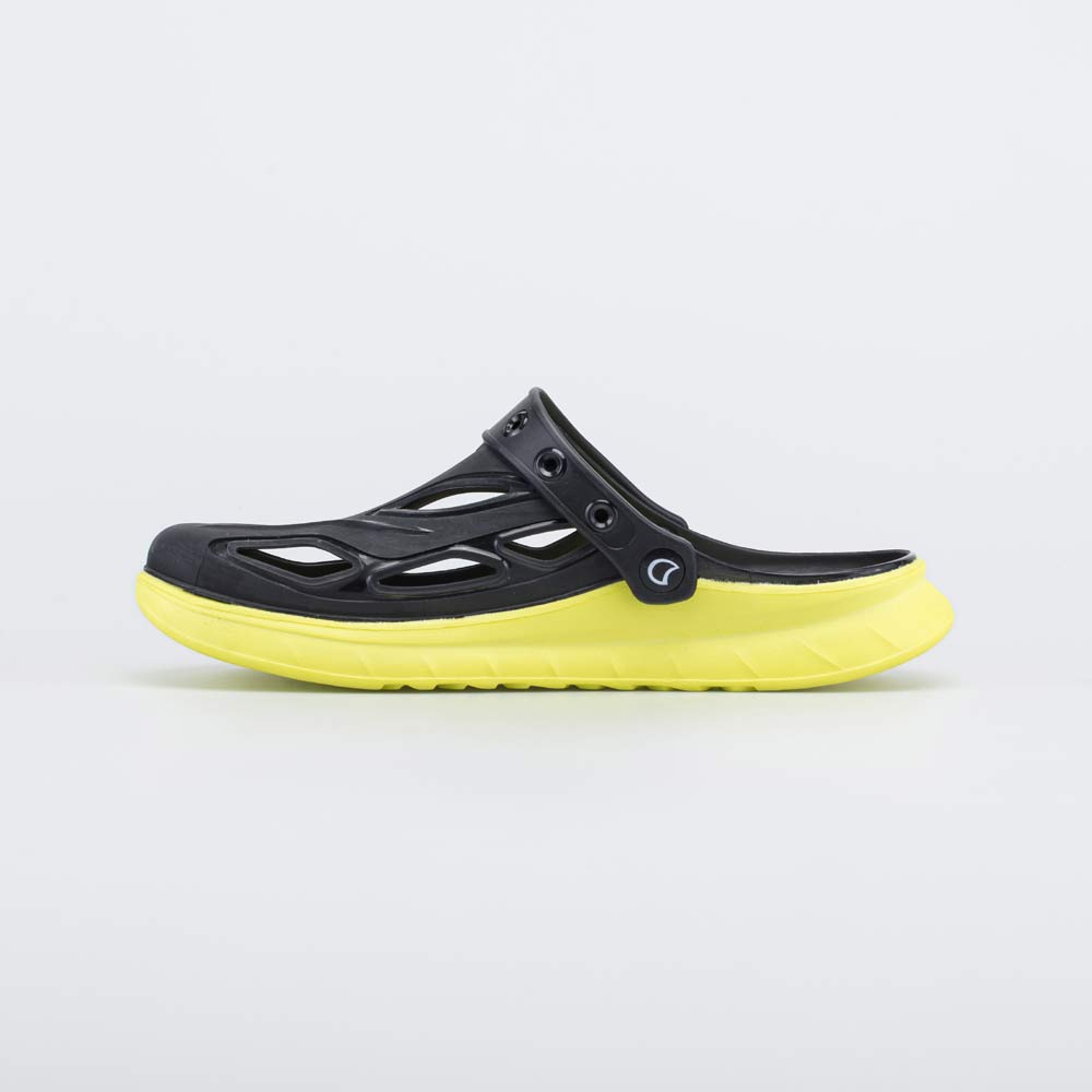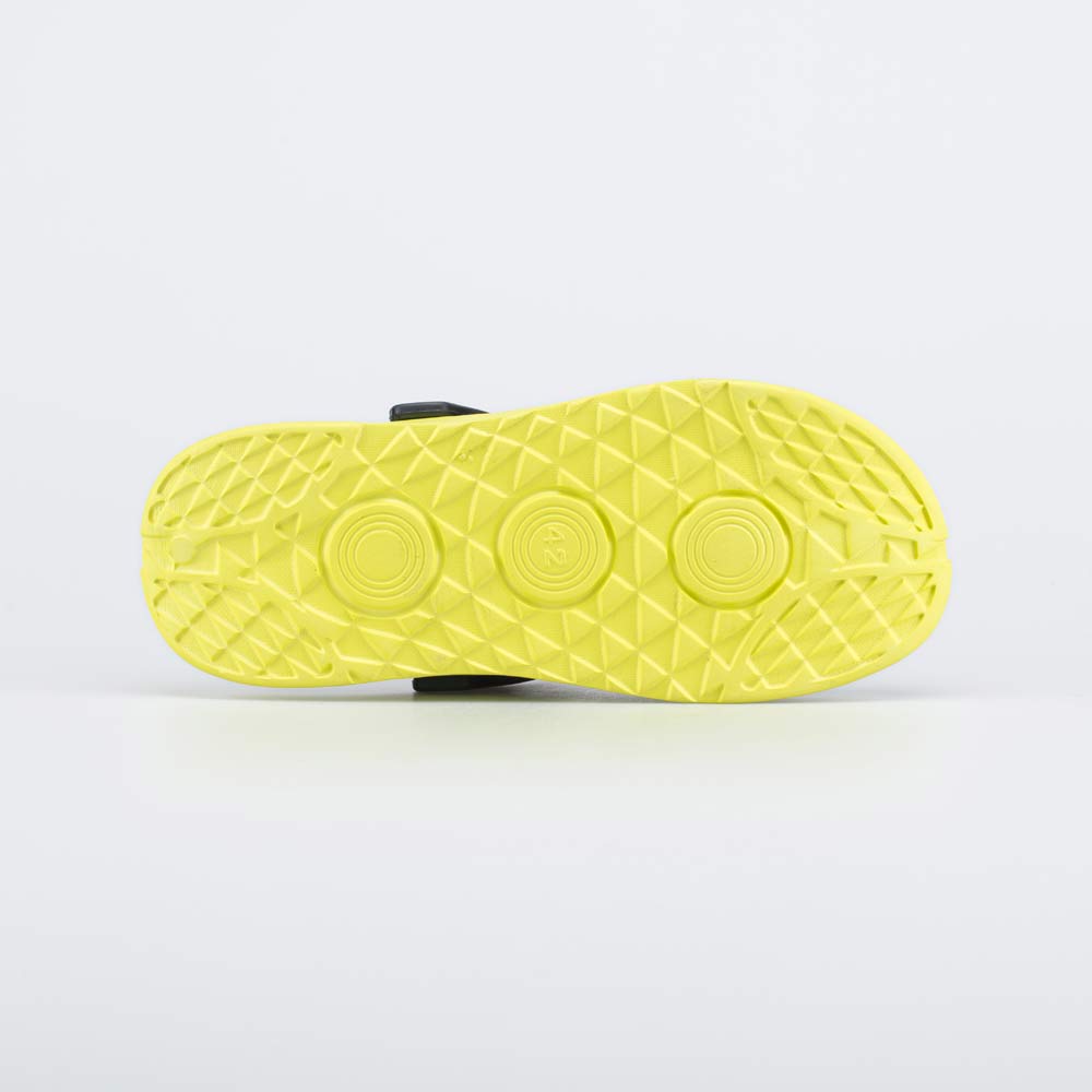 Анатомически правильная внутренняя форма соответствует изгибам подростковой стопы и обеспечивает необходимую поддержку. Рельефные элементы на стельке защищают мокрые ножки от скольжения. Яркая салатовая подошва на фоне черного цвета верха поднимает настроение.