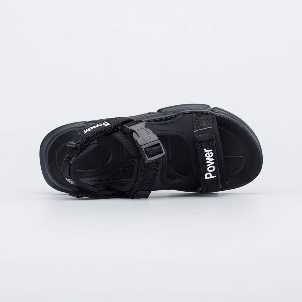 Сандалии выполнены в черном цвете и украшены ненавязчивой белой надписью.