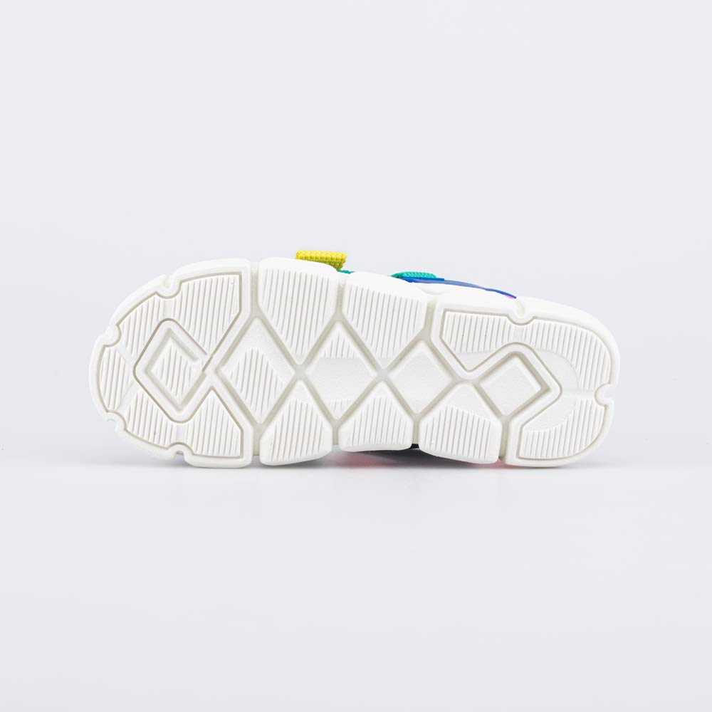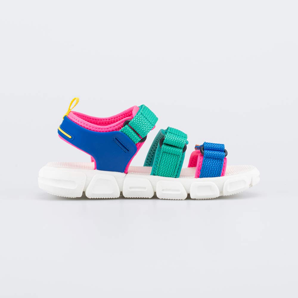 Яркие пляжные сандалии на липучках раскрасят летний образ девочки. Модель максимально открытая – подходит для жаркой погоды и быстро высыхает при намокании.