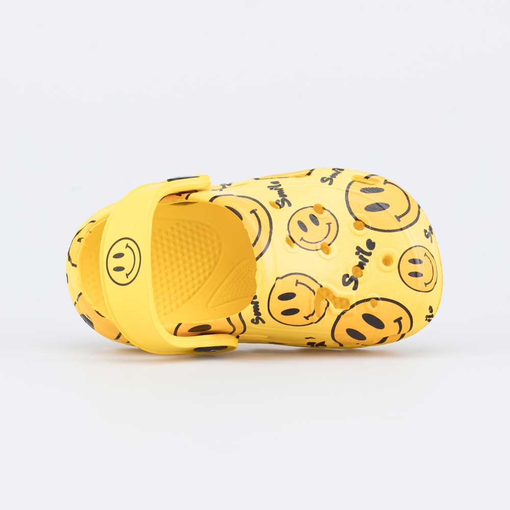 Детская пляжная обувь с закрытом носом защищает пальцы от песка и камней, а перфорация обеспечивает необходимую вентиляцию. Перекидной ремешок надежно фиксирует обувь на ноге. Красочный принт в виде смайлов добавляет летнего настроения.