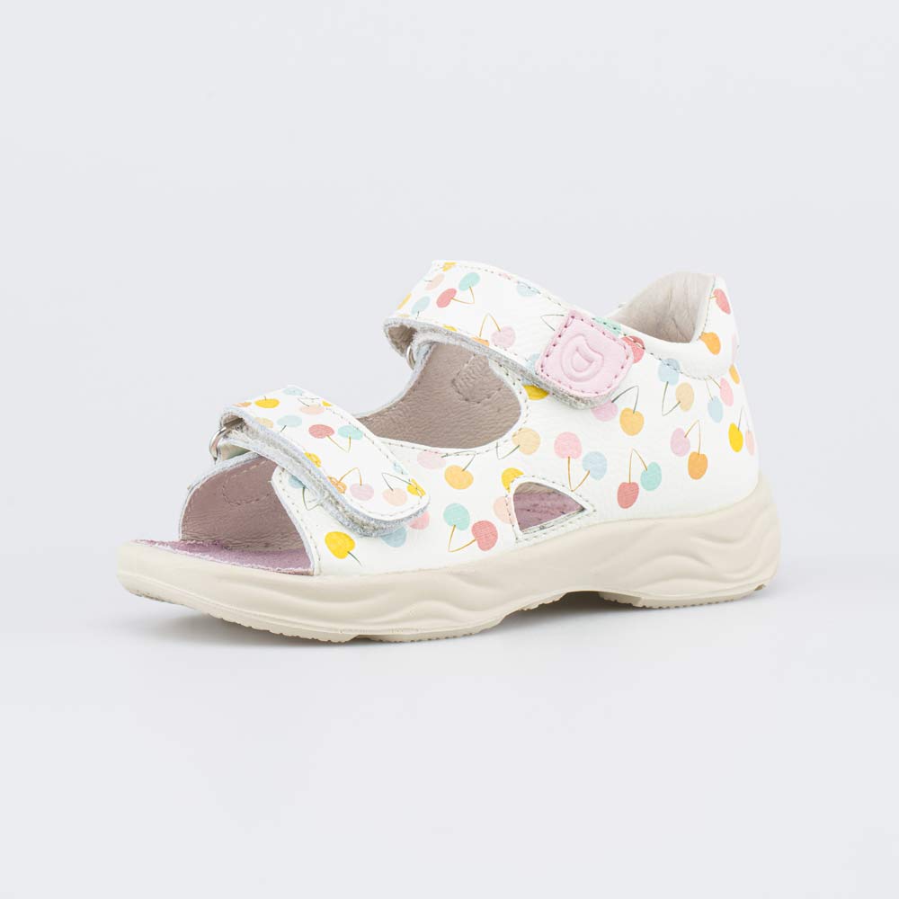 Летние кожаные сандалии Котофей с открытым носом украшены принтом в виде акварельных вишенок и отлично подходят для прогулок или в садик.