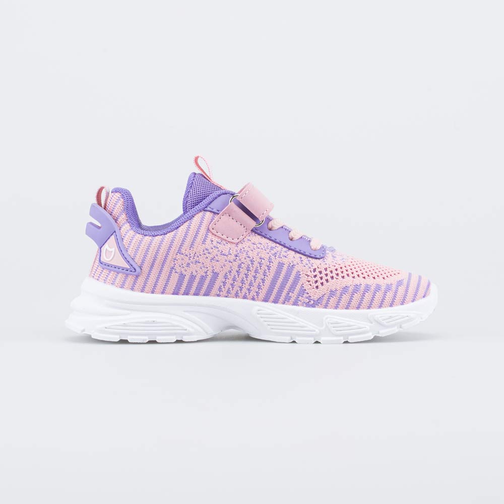 Детские кроссовки выглядят нарядно за счет эффектного сочетания розового и сиреневого цветов.