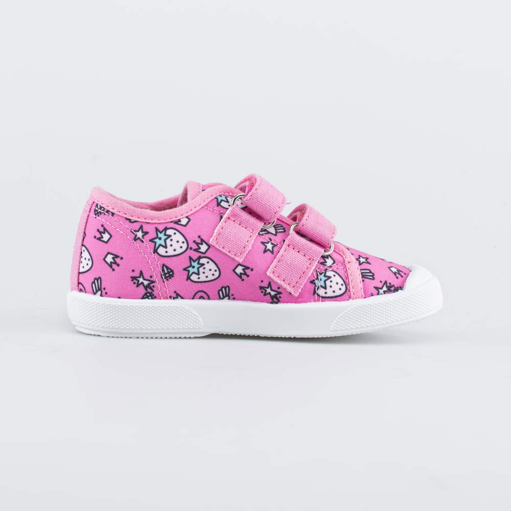 Текстильные розовые кеды для девочки украшены модным принтом в виде единорогов, что придает им современный внешний вид.