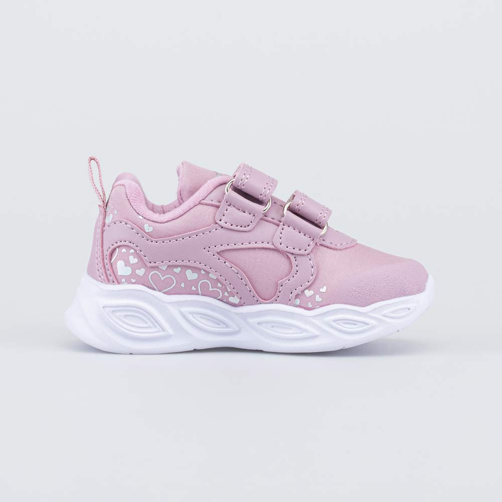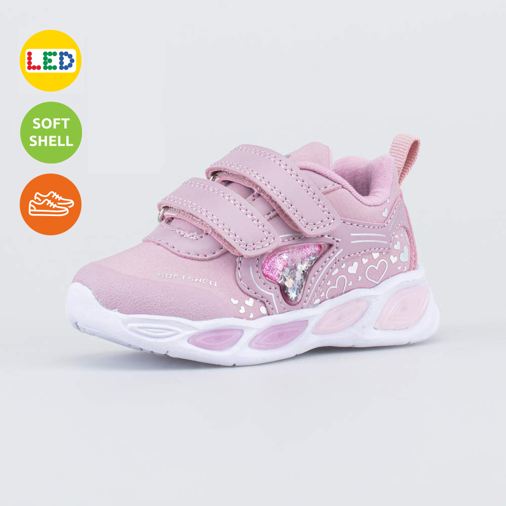 Анатомическая подошва из ЭВА оснащена мигающими светодиодами, которые срабатывают от ударной нагрузки. Дополнительную изюминку придают сердечки, наполненные глиттером.