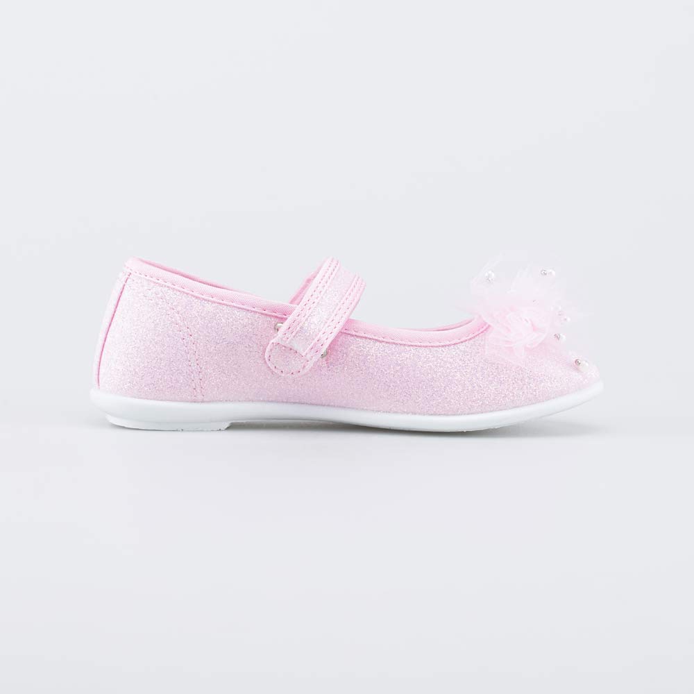 Нарядные розовые туфли для девочки, украшенные пушистым бантиком с бусинами, подходят для праздника в детском саду или семейной фотосессии.