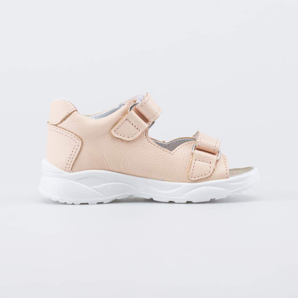 Детские сандалии имеют верх из натуральной кожи розового цвета. Подкладка и несъемная стелька из белой натуральной кожи обеспечивают гигиенические свойства и защищают носочки от окрашивания.
