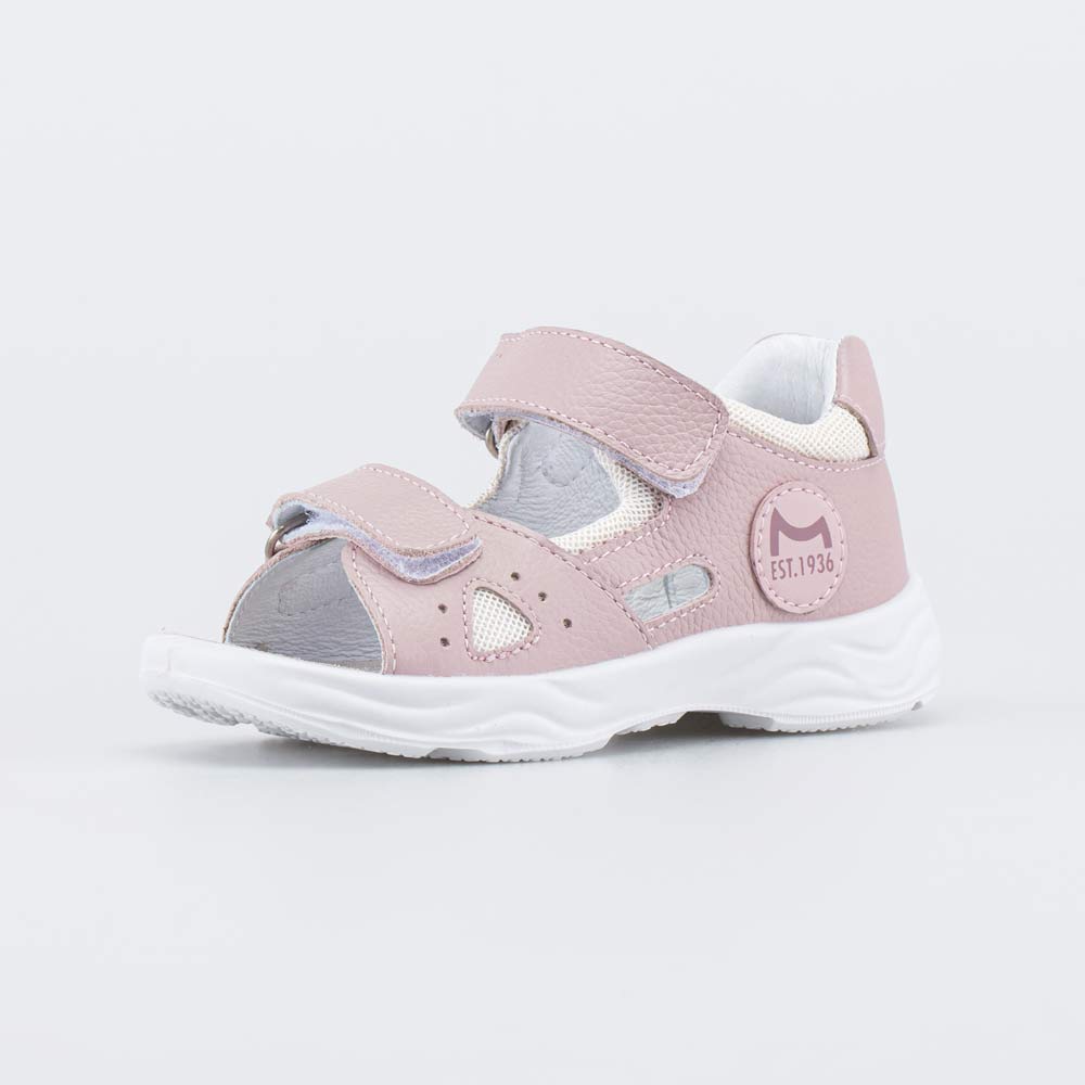 Верх розовых сандалий выполнен из гипоаллергенной и дышащей натуральной кожи, дополненной деталями из мягкого сетчатого текстиля. Украшен нашивкой с надписью 1936 – год основания фабрики «Егорьевск-обувь».