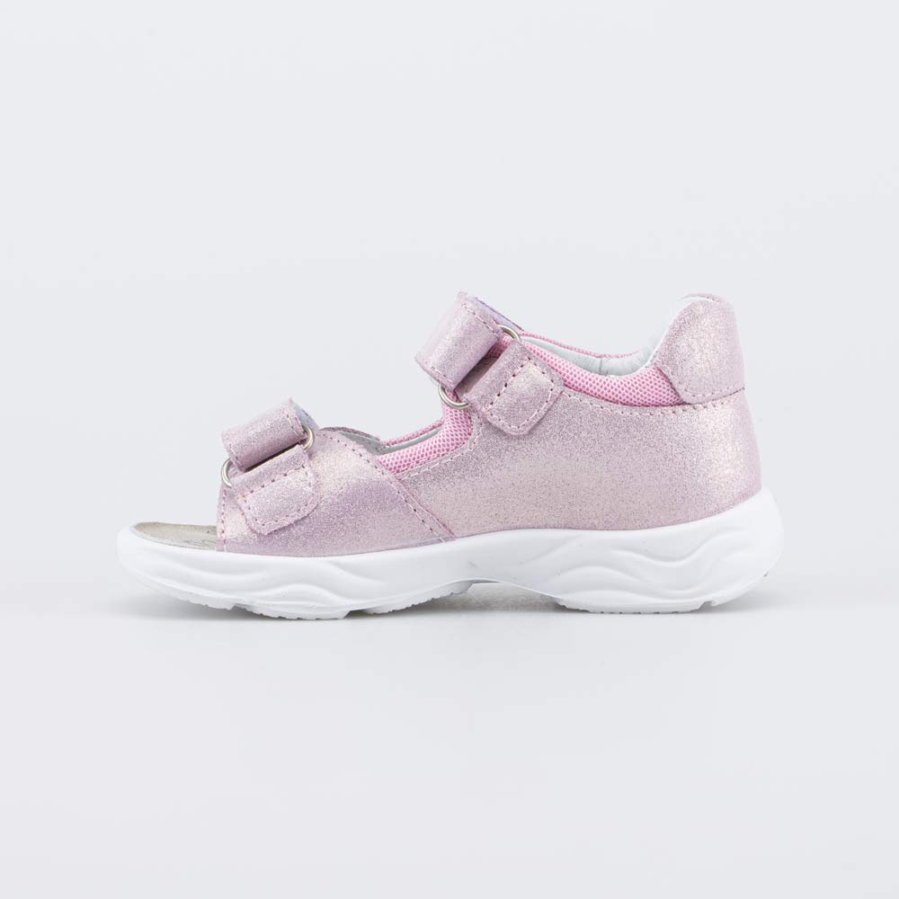 Детские сандалии имеют верх из натурального велюра розового цвета, который дополнен дышащим текстилем в сеточку. Подкладка и несъемная стелька из белой натуральной кожи обеспечивают гигиенические свойства и защищают носочки от окрашивания.