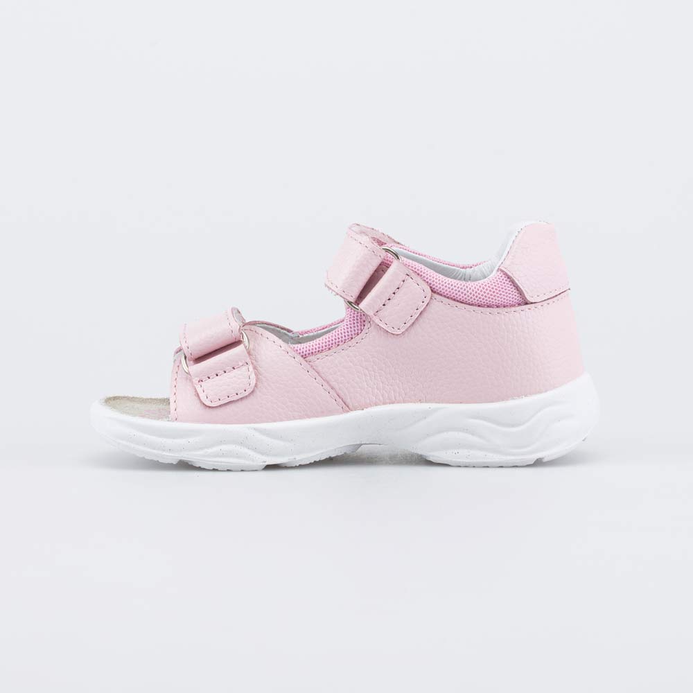 Детские сандалии имеют верх из натуральной кожи розового цвета, который дополнен дышащим текстилем в сеточку и украшен сердечком с надписью. Подкладка и несъемная стелька из белой натуральной кожи обеспечивают гигиенические свойства и защищают носочки от окрашивания.