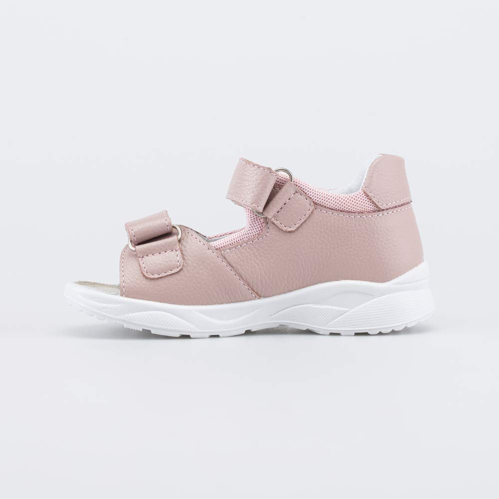 Детские сандалии имеют верх из натуральной кожи розового цвета, которая дополнена текстилем в сеточку и декорирована фигурной перфорацией в виде сердечек. Подкладка и несъемная стелька из белой натуральной кожи обеспечивают гигиенические свойства и защищают носочки от окрашивания.