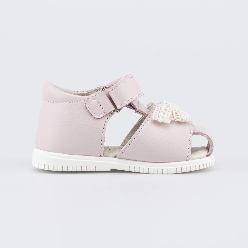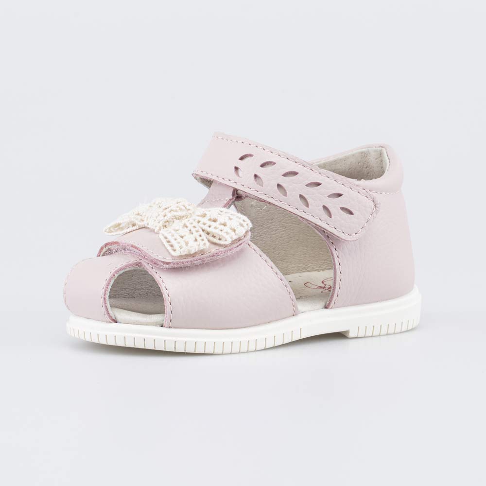 Верх изготовлен из натуральной кожи пыльно-розового цвета и украшен кружевным батиком. Подкладка и несъемная стелька также выполнены из натуральной кожи, что обеспечивает оптимальный микроклимат внутри детской обуви.