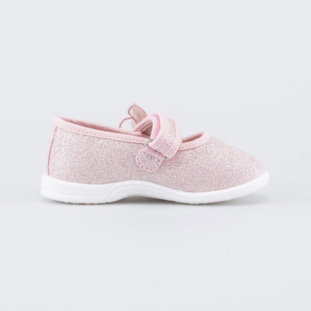 Верх этих розовых туфелек выполнен из гипоаллергенного синтетического материала с эффектом блеска.