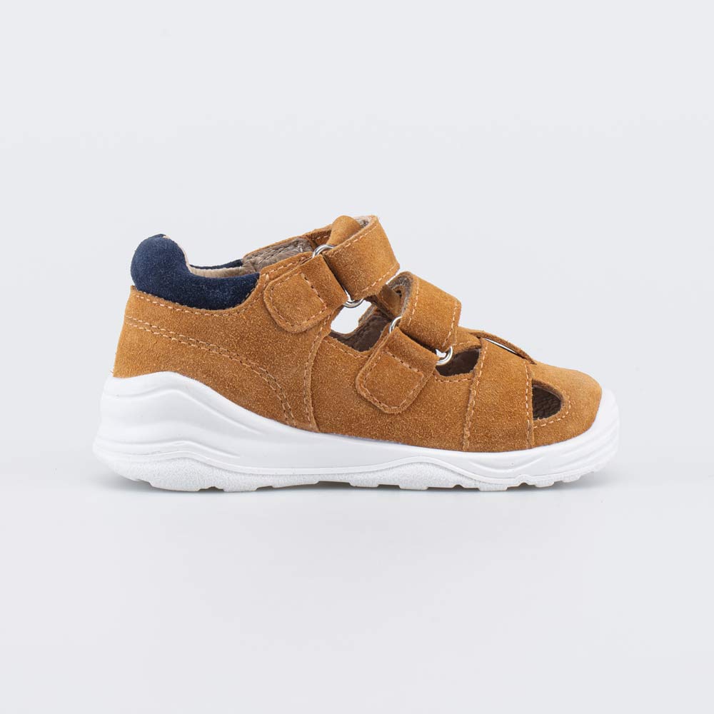Детские сандалии имеют верх из натурального велюра рыже-коричневого цвета. Подкладка и несъемная стелька из белой натуральной кожи обеспечивают гигиенические свойства и защищают носочки от окрашивания.