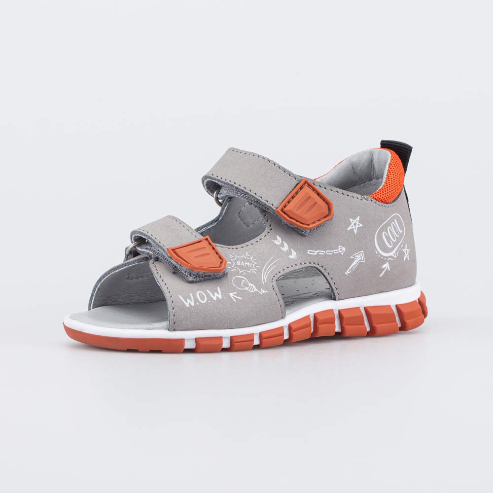 Детские сандалии имеют верх из натурального нубука и украшены принтом. Подкладка и несъемная стелька из светлой натуральной кожи обеспечивают гигиенические свойства и защищают носочки от окрашивания.