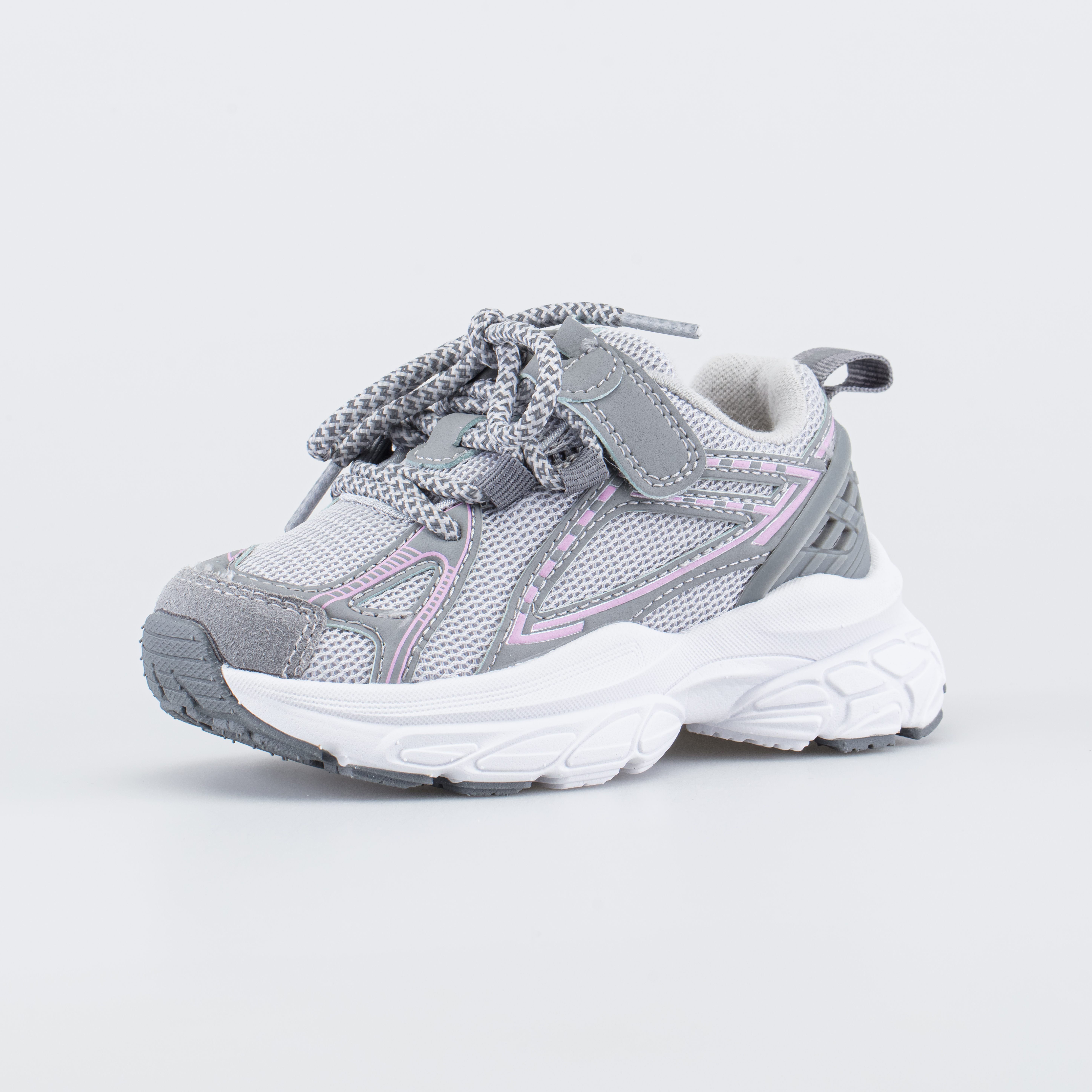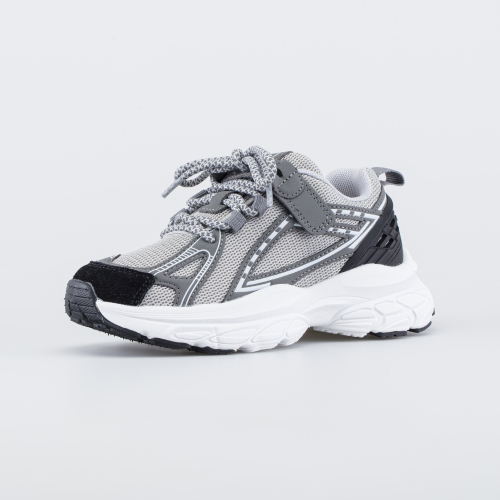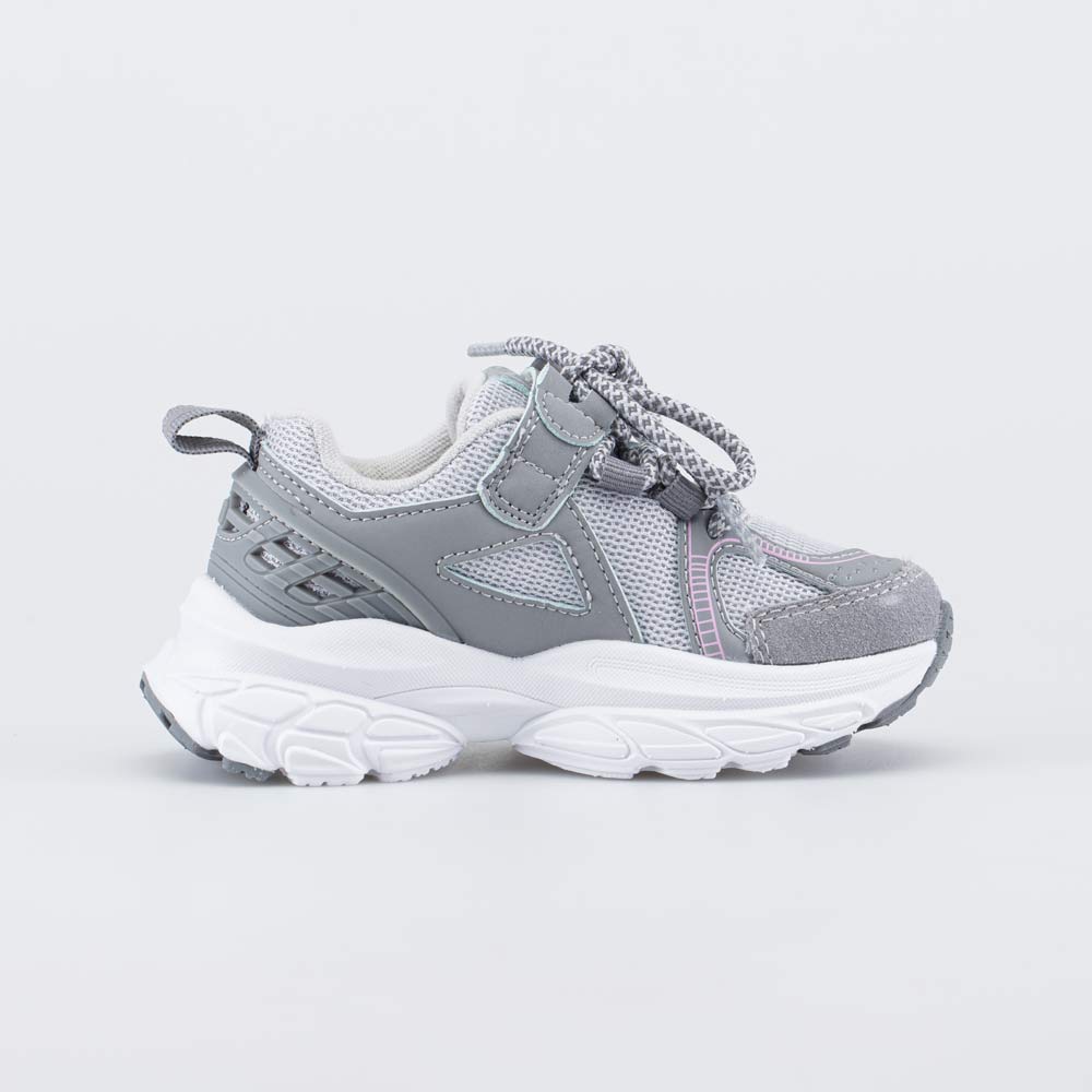 Модные кроссовки для девочки выполнены в трендовом сером цвете с легким акцентом розового.