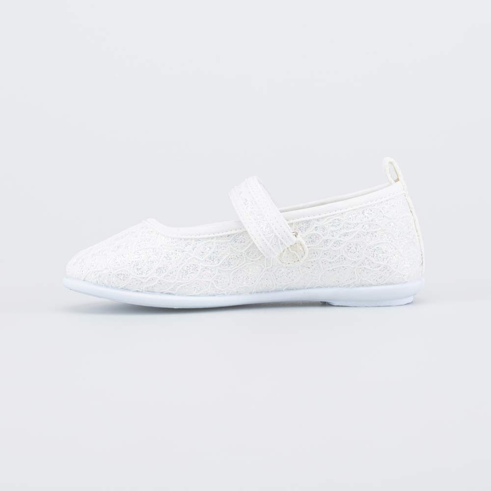 Нарядные туфли для девочки в серебристом цвете, подходят для праздника или семейной фотосессии.