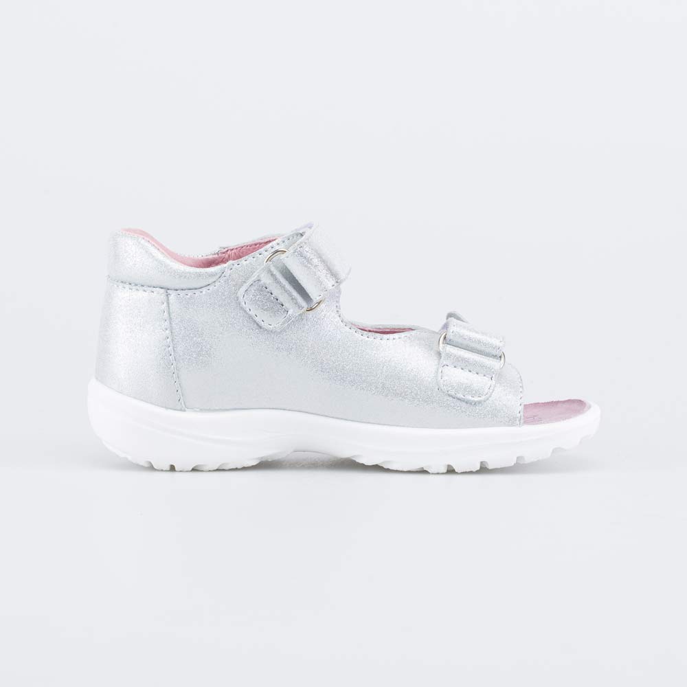 Детские сандалии имеют верх, подкладку и стельку из натуральной кожи – гипоаллергенного и дышащего материала, который обеспечивает высокие гигиенические свойства. Легкий серебристый блеск придает модели нарядный вид.