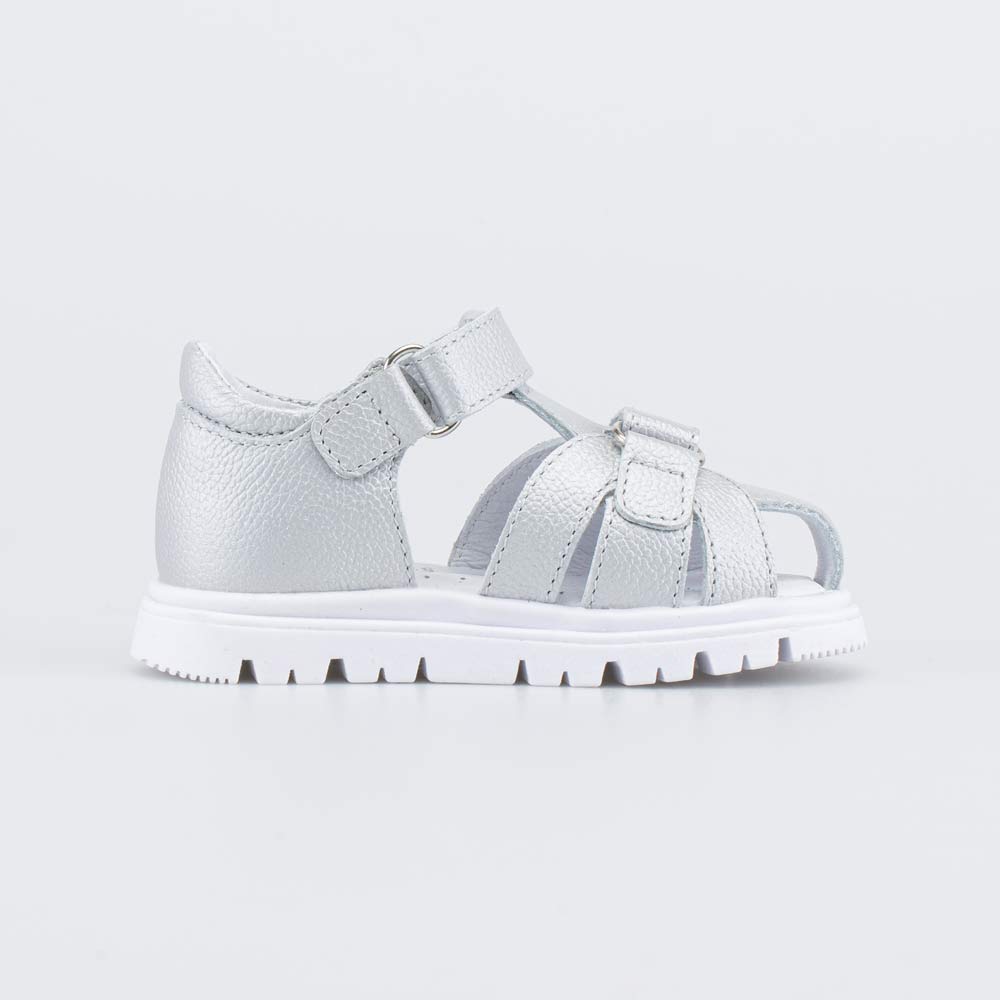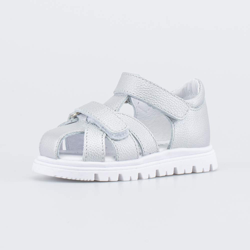 Серебристые сандалии подходят для девочки, которая только начинает ходить.