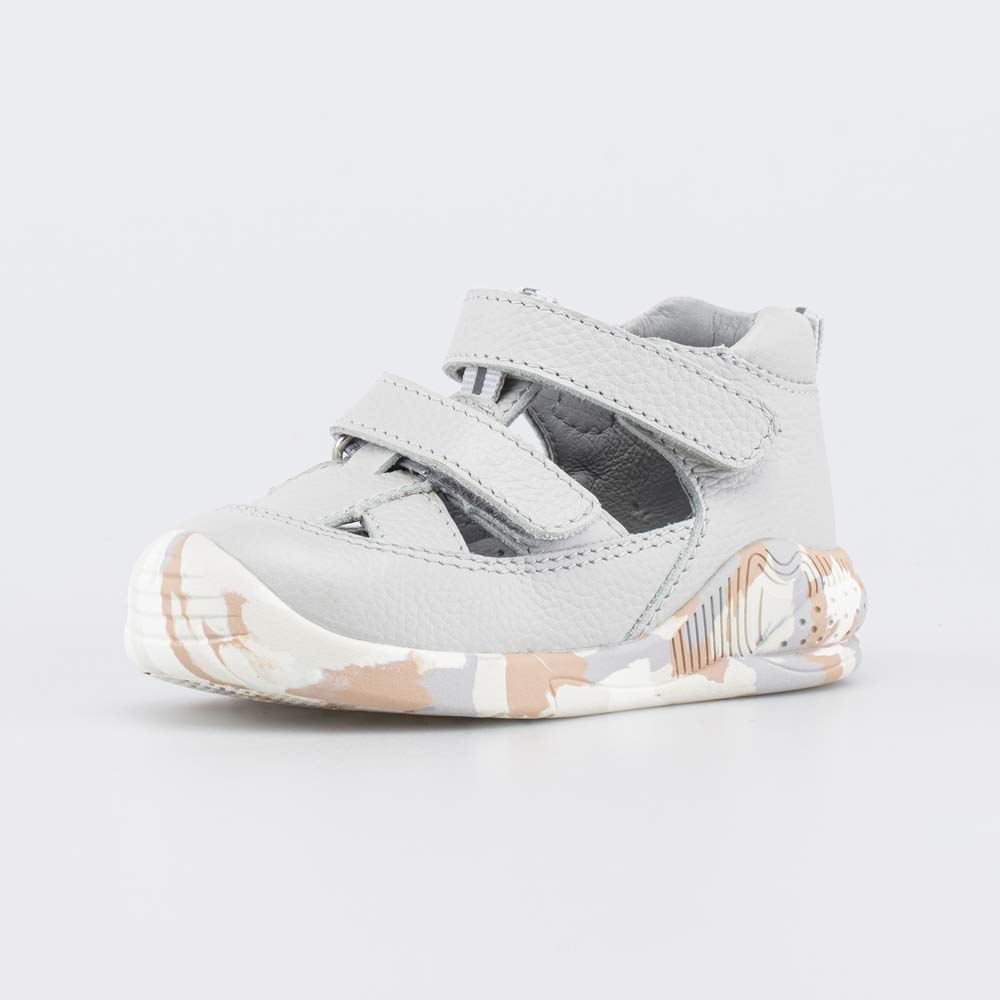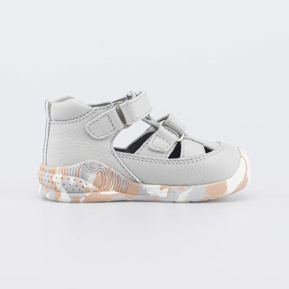 Детские сандалии имеют верх из натуральной кожи серого цвета. Подкладка и несъемная стелька из белой натуральной кожи обеспечивают гигиенические свойства и защищают носочки от окрашивания.