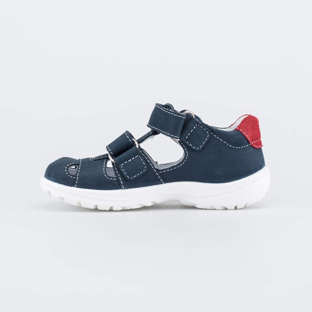 Верх выполнен из натурального нубука синего цвета с красным акцентом. Подкладка и стелька – из гипоаллергенной и дышащей натуральной гладкой кожи.