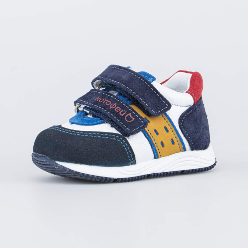 Верх выполнен из натуральной кожи-нубука, подкладка и стелька – из гладкой и мягкой подкладочной кожи. Материалы позволяют стопам дышать и обеспечивают здоровый микроклимат внутри детской обуви.