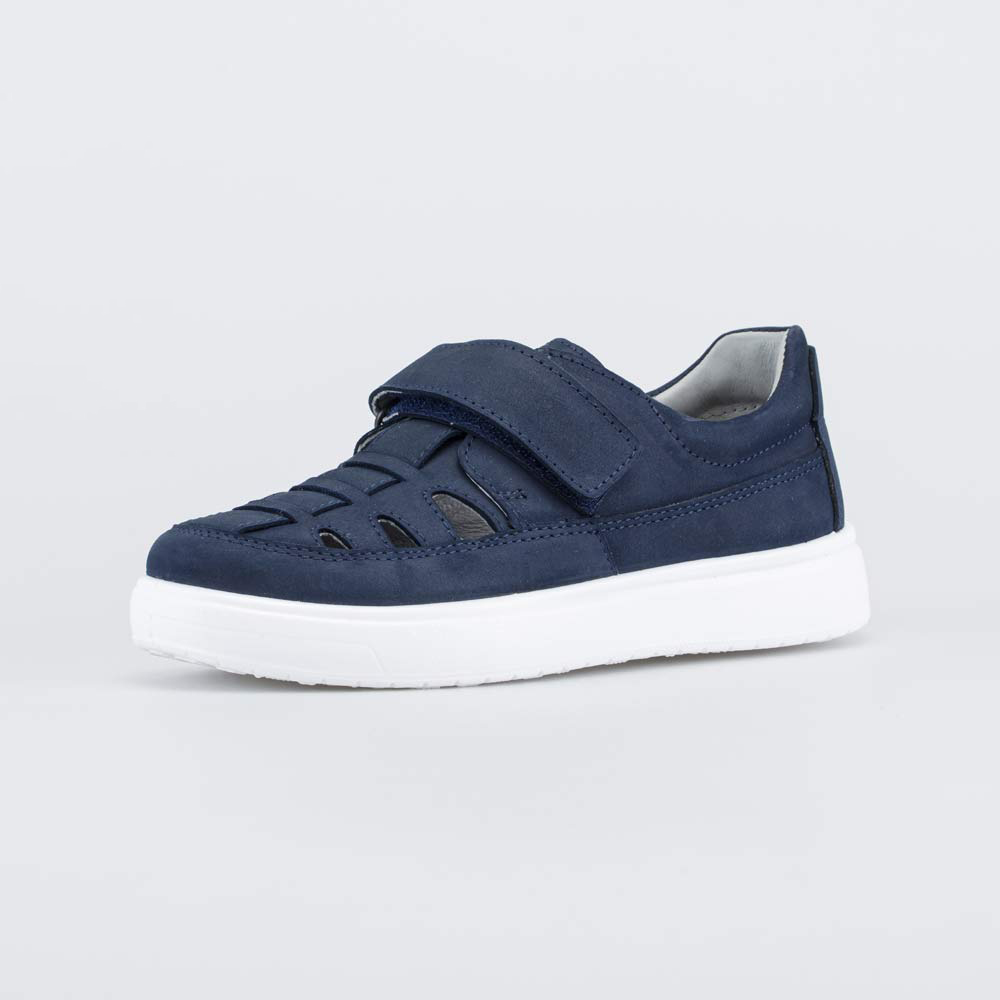 Верх изготовлен из гипоаллергенной и дышащей натуральной кожи-нубука синего цвета. Подкладка и стелька выполнены из белой натуральной кожи – не придется переживать, что школьная обувь окрасит носочки.