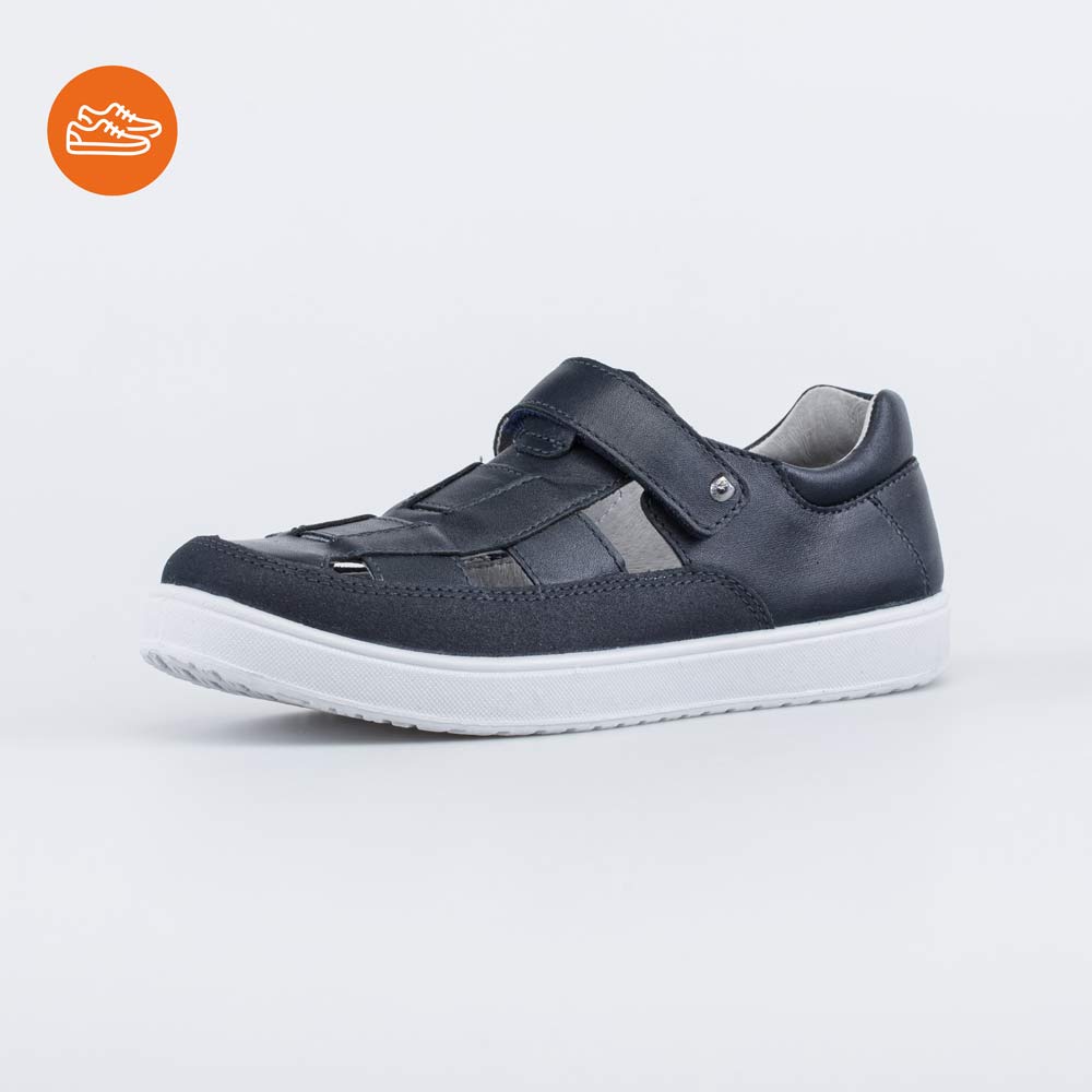 Кожаные туфли синего цвета подходят для мальчика-школьника.