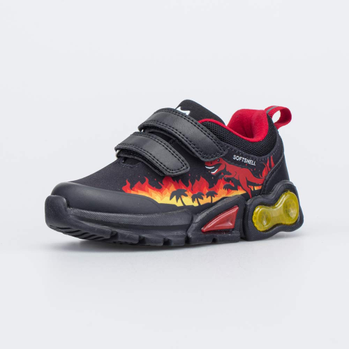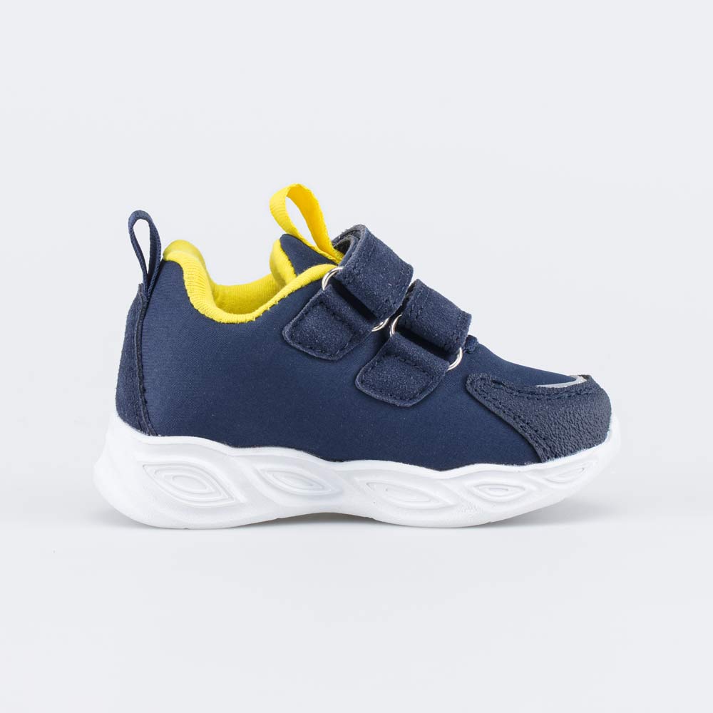 Анатомическая подошва из ЭВА оснащена мигающими светодиодами, которые срабатывают от ударной нагрузки. Дополнительную изюминку придают контрастные желтые детали и надпись Sport на внешней части кроссовок.