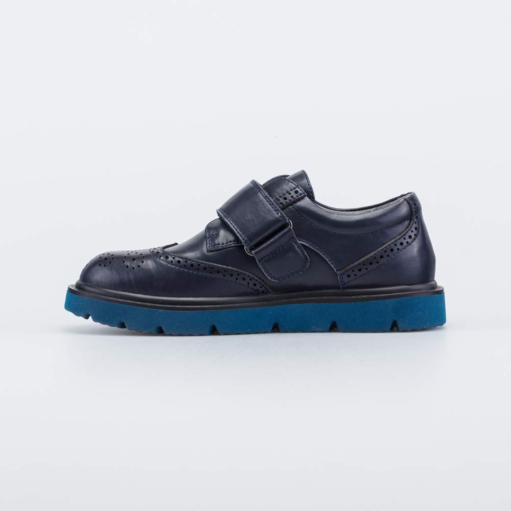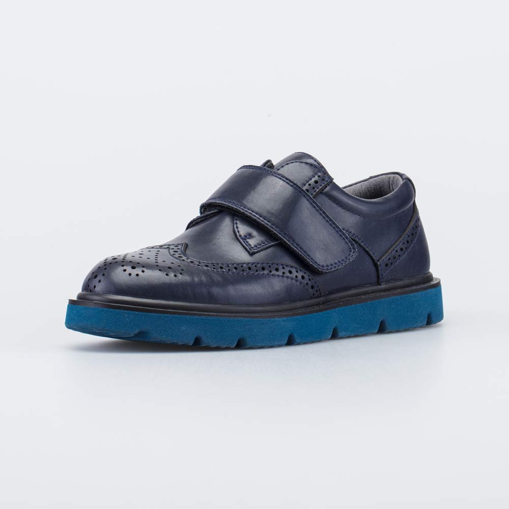Синие кожаные туфли для мальчика, украшенные декоративной перфорацией, отлично смотрятся как со школьной формой, так и с классическими праздничными образами.