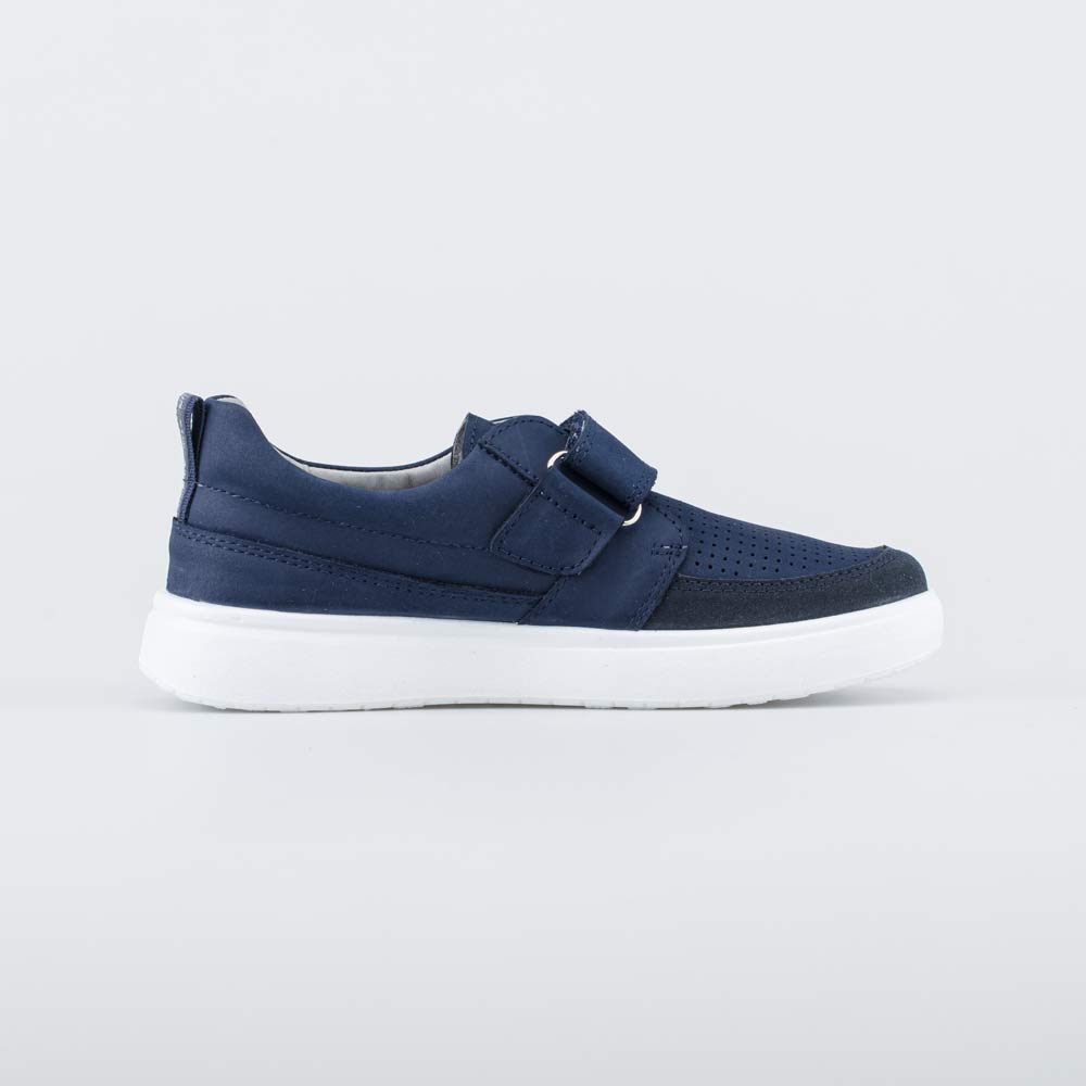 Удобные синие туфли имеют верх из гипоаллергенной и дышащей натуральной кожи-нубука. Перфорация увеличивает воздухопроницаемость школьной обуви, обеспечивая комфорт в течение долгого учебного дня. Дополнительная кожаная накладка с ПУ-напылением защищает носочную часть от повреждений.