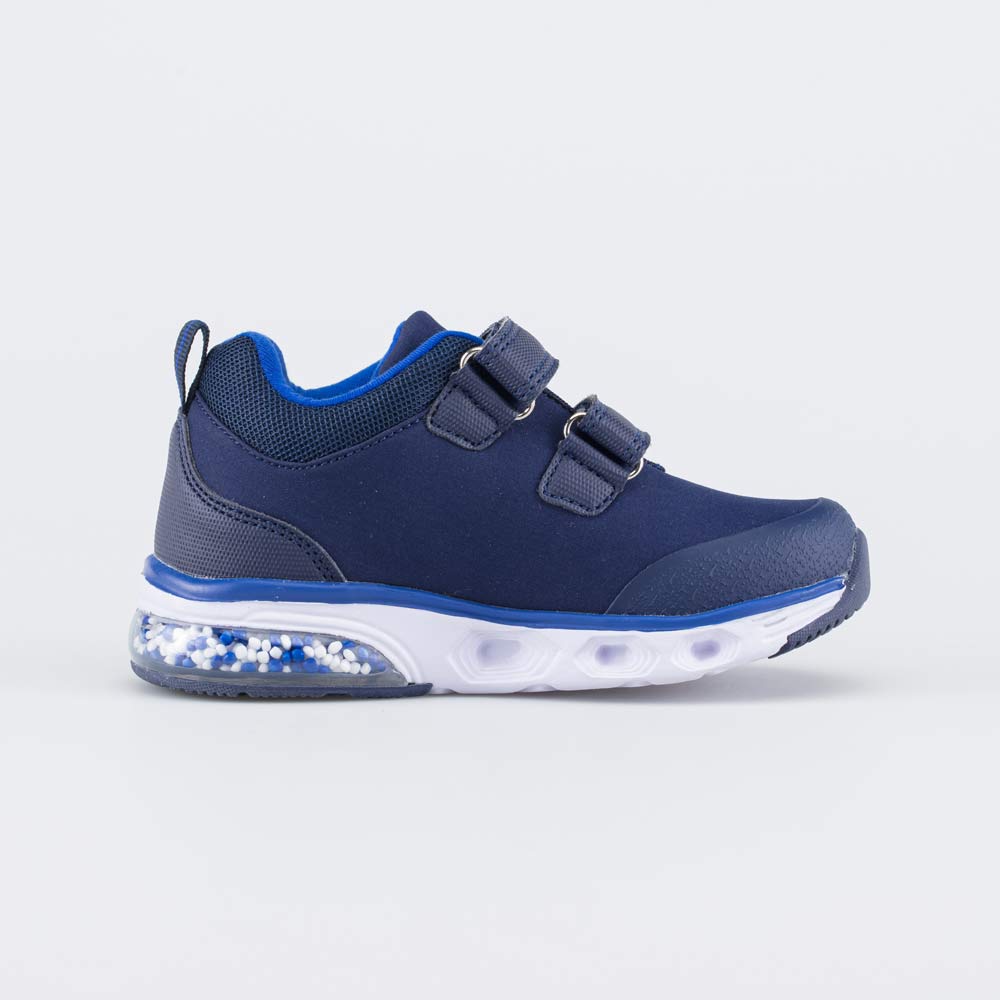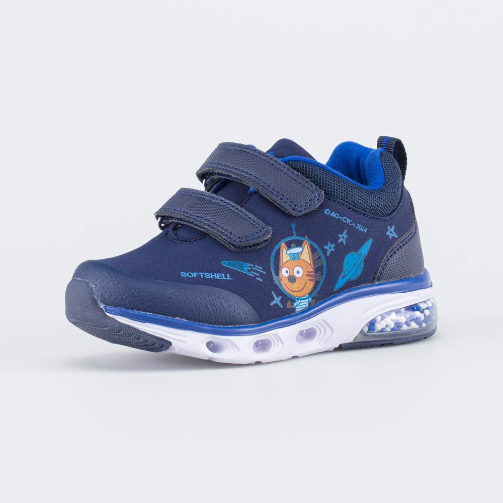 Анатомическая подошва из ЭВА оснащена мигающими светодиодами, которые срабатывают от ударной нагрузки. Дополнительную изюминку придают контрастные цветные вставки, прошитые металлизированной нитью, и принт в виде героев мультфильма Три кота.