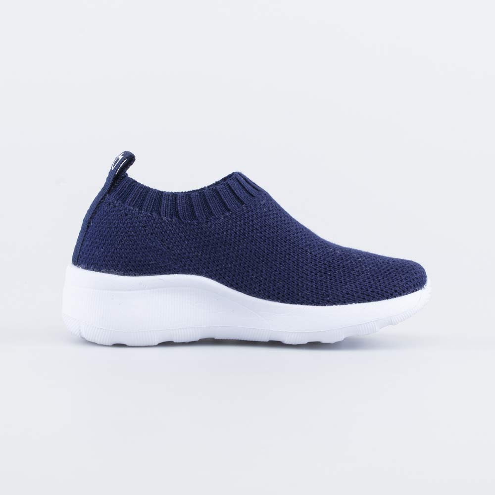 Верх синих кроссовок для мальчика изготовлен из гипоаллергенного вязаного текстиля (полиэстер). Отсутствие подкладки и плотных вставок в районе носка и пятки обеспечивает высокий уровень вентиляции в детской обуви.