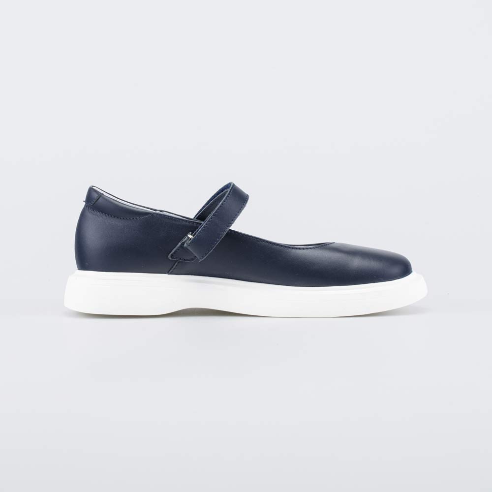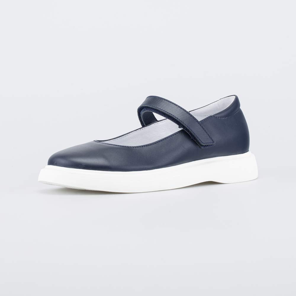 Верх выполнен из гипоаллергенной и дышащей натуральной кожи синего цвета. Подкладка и стелька – из белой натуральной кожи. Не придется переживать, что школьная обувь окрасит носочки или колготки.
