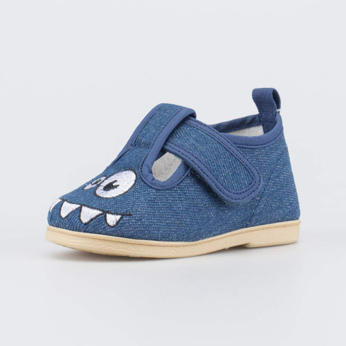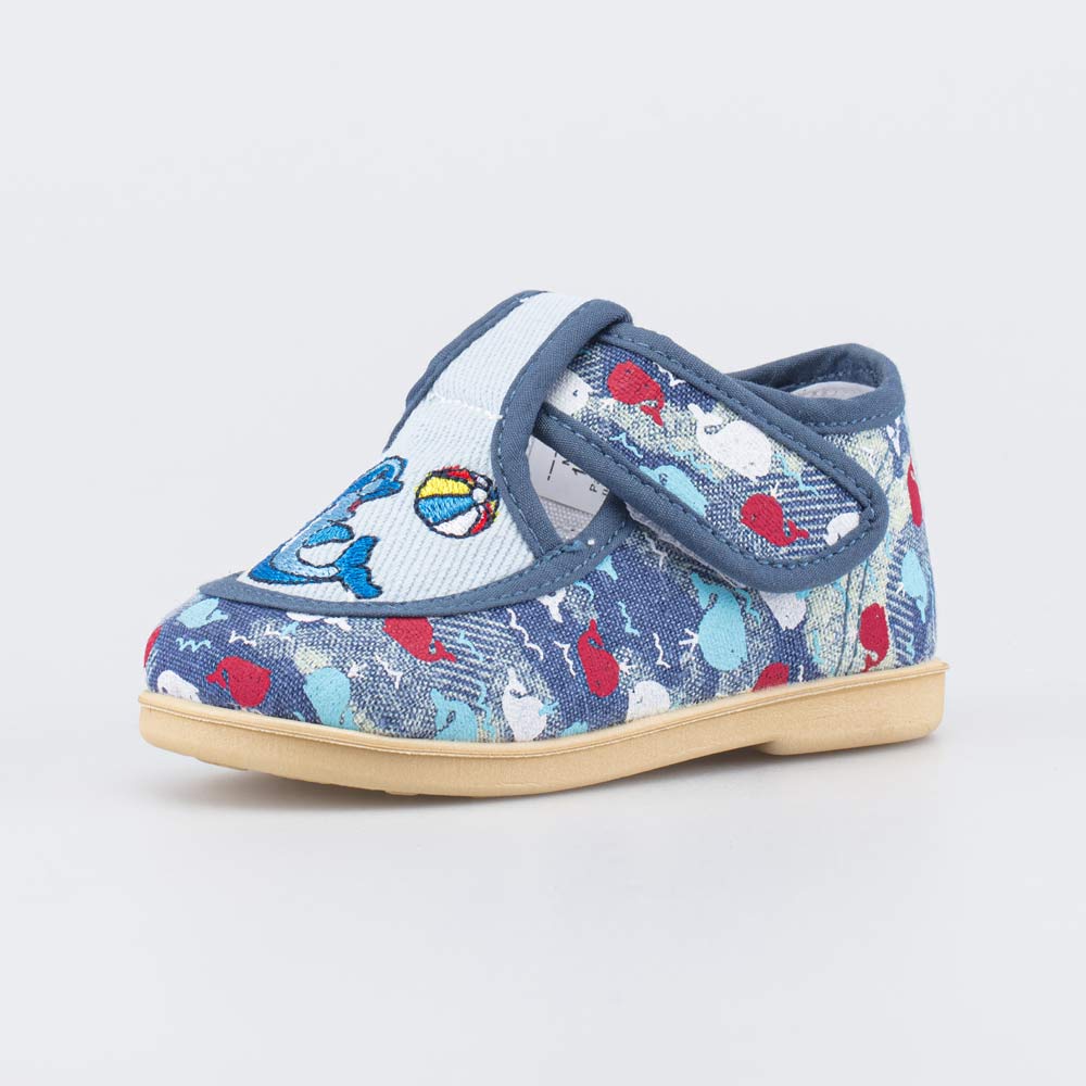 Верх выполнен из текстиля синего цвета и украшен вышивкой в виде дельфиненка с мячом. Подкладка и несъемная стелька из 100% хлопка обеспечивают максимально комфортный микроклимат для детской ножки.
